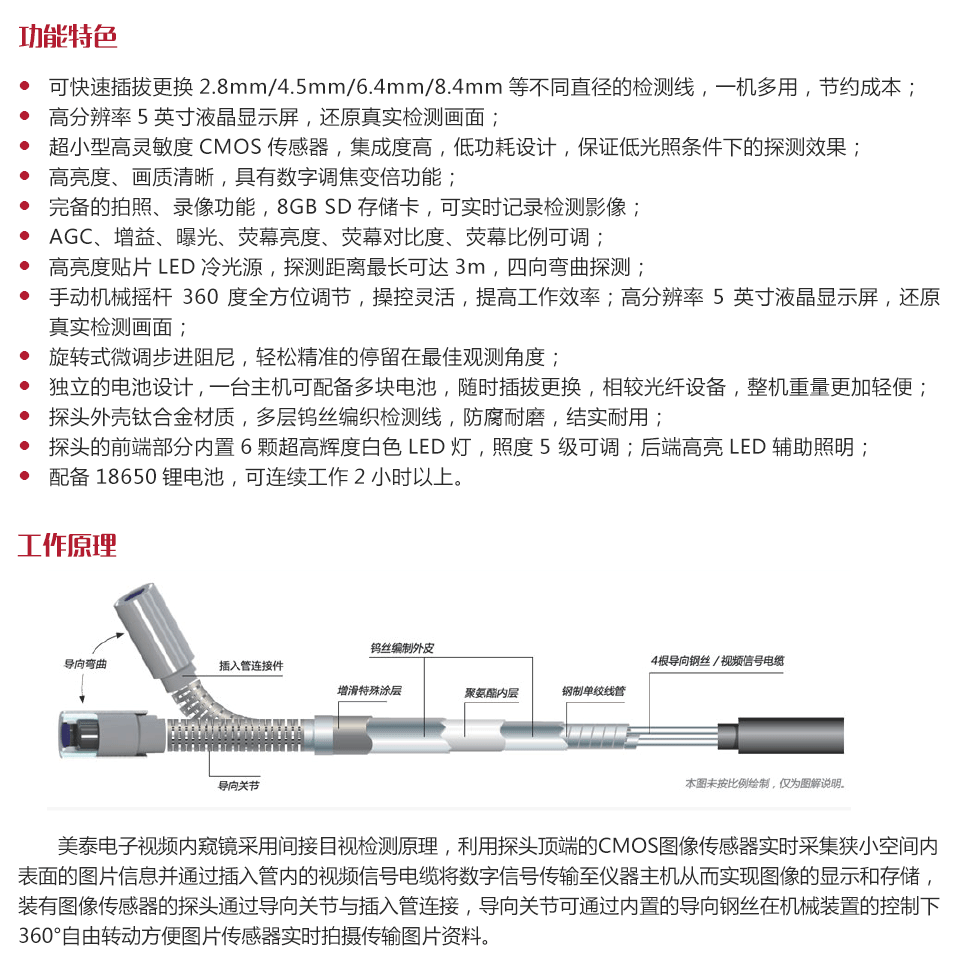 工作原理美泰電子視頻內(nèi)窺鏡采用間接目視檢測(cè)原理,利用探頭頂端的CMOS圖像傳感器實(shí)時(shí)采集狹小空間內(nèi)表面的圖片信息并通過(guò)插入管內(nèi)的視頻信號(hào)電纜將數(shù)字信號(hào)傳輸至儀器主機(jī)從而實(shí)現(xiàn)圖像的顯示和存儲(chǔ),裝有圖像傳感器的探頭通過(guò)導(dǎo)向關(guān)節(jié)與插入管連接,導(dǎo)向關(guān)節(jié)可通過(guò)內(nèi)置的導(dǎo)向鋼絲在機(jī)械裝置的控制下360°自由轉(zhuǎn)動(dòng)方便圖片傳感器實(shí)時(shí)拍攝傳輸圖片資料。