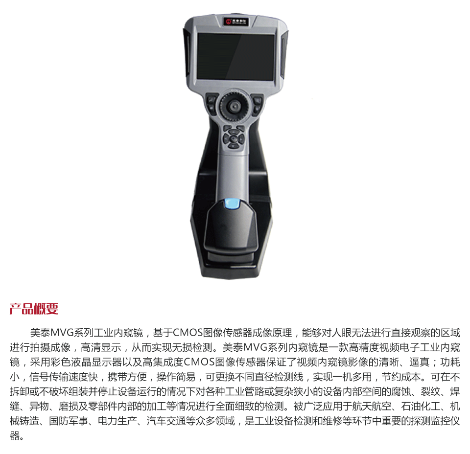 美泰MVG系列工業(yè)內(nèi)窺鏡,基于CMOS圖像傳感器成像原理,能夠對(duì)人眼無(wú)法進(jìn)行直接觀察的區(qū)域進(jìn)行拍攝成像,高清顯示,從而實(shí)現(xiàn)無(wú)損檢測(cè)。美泰MVG系列內(nèi)窺鏡是一款高精度視頻電子工業(yè)內(nèi)窺鏡,采用彩色液晶顯示器以及高集成度CMOS圖像傳感器保證了視頻內(nèi)窺鏡影像的清晰、逼真;功耗小,信號(hào)傳輸速度快,攜帶方便,操作簡(jiǎn)易,可更換不同直徑檢測(cè)線,實(shí)現(xiàn)一機(jī)多用,節(jié)約成本??稍?/span>不拆卸或不破壞組裝并停止設(shè)備運(yùn)行的情況下對(duì)各種工業(yè)管路或復(fù)雜狹小的設(shè)備內(nèi)部空間的腐蝕、裂紋、焊縫、異物、磨損及零部件內(nèi)部的加工等情況進(jìn)行全面細(xì)致的檢測(cè)。被廣泛應(yīng)用于航天航空、石油化工、機(jī)械鑄造、國(guó)防軍事、電力生產(chǎn)、汽車交通等眾多領(lǐng)域,是工業(yè)設(shè)備檢測(cè)和維修等環(huán)節(jié)中重要的探測(cè)監(jiān)控儀器。
