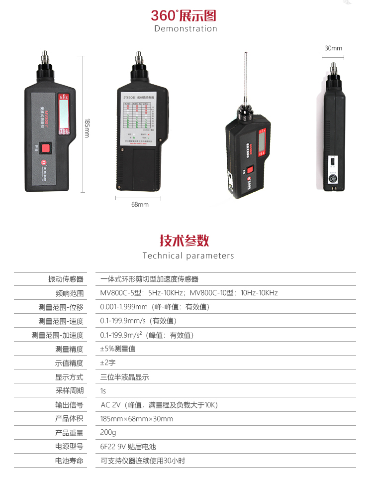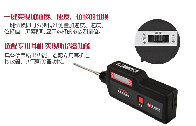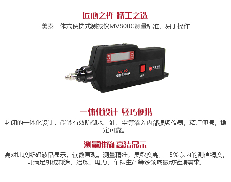 產(chǎn)品概述美泰袖珍一體化測振儀MV800C系列是由壓電式傳感器和數(shù)字顯示電路組成的手持式測振儀表,主要用于測量各種旋轉(zhuǎn)機(jī)械的振動加速度、速度和位移。MV800C系列分兩種型號MV800C-5(頻響范圍:5Hz~10KHz)和MV800C-10(頻響范圍:10Hz~10KH),可滿足常規(guī)測振使用需求以及低頻振動測量需求。該產(chǎn)品測量范圍廣,顯示直觀、一體化的設(shè)計體積小、重量輕,測量攜帶方便,特別適用于野外無電源的現(xiàn)場作業(yè)及高空作業(yè),大大減少工作人員的工作強(qiáng)度,提高工作效率。