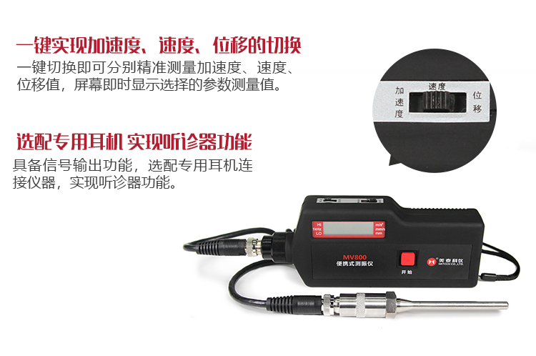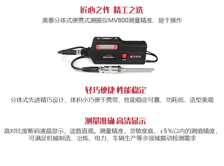 產(chǎn)品概述美泰便攜式測振儀MV800系列是由壓電式傳感器和數(shù)字顯示電路組成的手持式測振儀表,主要用于測量各種旋轉(zhuǎn)機械的振動加速度、速度和位移。MV800系列分兩種型號MV800-5(頻響范圍:5Hz~10KHz)和MV800-10(頻響范圍:10Hz~10KH),可滿足常規(guī)測振使用需求以及低頻振動測量需求。該產(chǎn)品測量范圍廣,顯示直觀、一體化的設(shè)計體積小、重量輕,測量攜帶方便,特別適用于野外無電源的現(xiàn)場作業(yè)及高空作業(yè),大大減少工作人員的工作強度,提高工作效率。