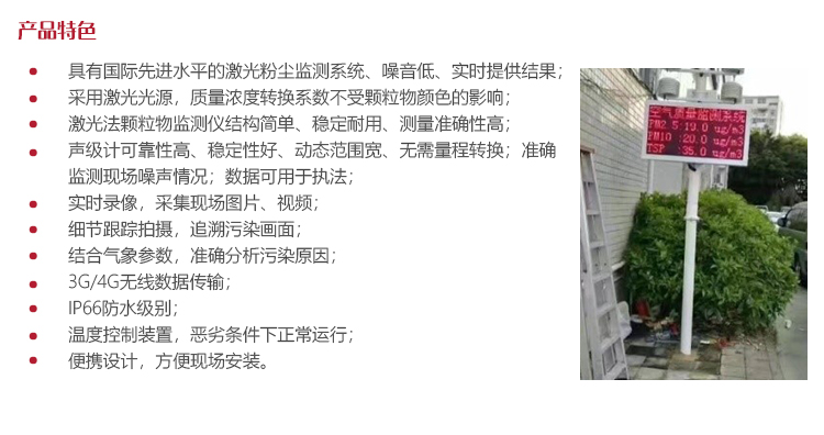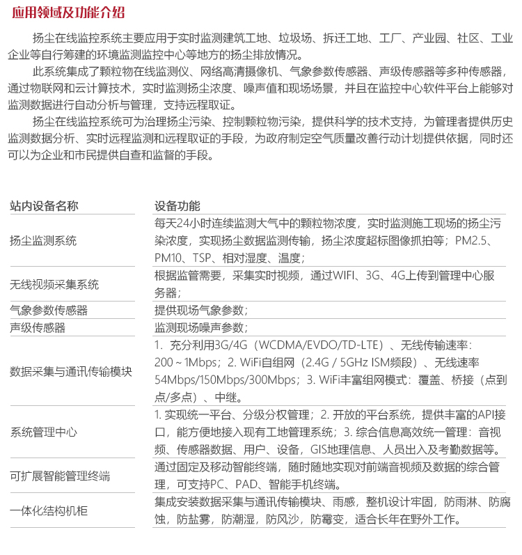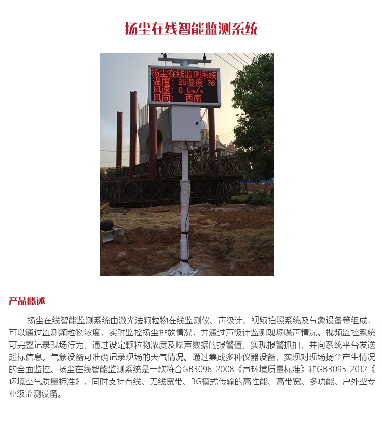 產(chǎn)品概述揚塵在線智能監(jiān)測系統(tǒng)由激光法顆粒物在線監(jiān)測儀、聲級計、視頻拍照系統(tǒng)及氣象設(shè)備等組成,可以通過監(jiān)測顆粒物濃度,實時監(jiān)控揚塵排放情況,并通過聲級計監(jiān)測現(xiàn)場噪聲情況。視頻監(jiān)控系統(tǒng)可完整記錄現(xiàn)場行為,通過設(shè)定顆粒物濃度及噪聲數(shù)據(jù)的報警值,實現(xiàn)報警抓拍,并向系統(tǒng)平臺發(fā)送超標信息。氣象設(shè)備可準確記錄現(xiàn)場的天氣情況。通過集成多種儀器設(shè)備,實現(xiàn)對現(xiàn)場揚塵產(chǎn)生情況的全面監(jiān)控。揚塵在線智能監(jiān)測系統(tǒng)是一款符合GB3096-2008《聲環(huán)境質(zhì)量標準》和GB3095-2012《環(huán)境空氣質(zhì)量標準》,同時支持有線、無線寬帶、3G模式傳輸?shù)母咝阅?、高帶寬、多功能、戶外型專業(yè)級監(jiān)測設(shè)備。