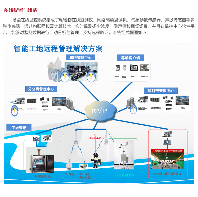 此系統(tǒng)集成了顆粒物在線監(jiān)測儀、網(wǎng)絡(luò)高清攝像機、氣象參數(shù)傳感器、聲級傳感器等多種傳感器,通過物聯(lián)網(wǎng)和云計算技術(shù),實時監(jiān)測揚塵濃度、噪聲值和現(xiàn)場場景,并且在監(jiān)控中心軟件平臺上能夠?qū)ΡO(jiān)測數(shù)據(jù)進行自動分析與管理,支持遠程取證。