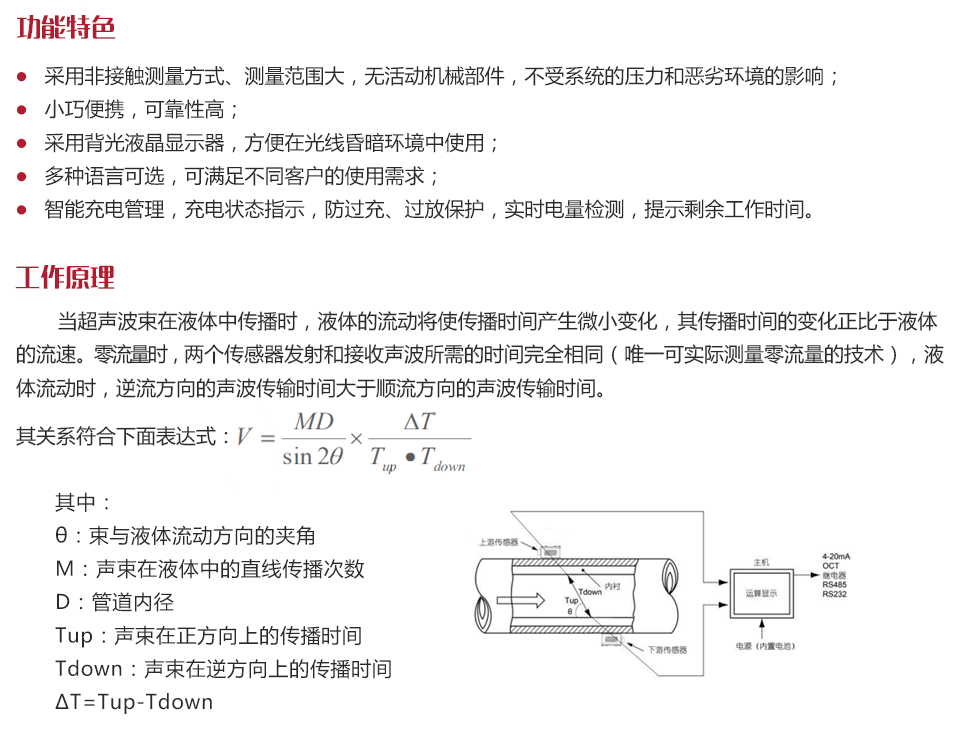 工作原理當(dāng)超聲波束在液體中傳播時(shí),液體的流動(dòng)將使傳播時(shí)間產(chǎn)生微小變化,其傳播時(shí)間的變化正比于液體的流速。零流量時(shí),兩個(gè)傳感器發(fā)射和接收聲波所需的時(shí)間完全相同(唯一可實(shí)際測量零流量的技術(shù)),液體流動(dòng)時(shí),逆流方向的聲波傳輸時(shí)間大于順流方向的聲波傳輸時(shí)間。