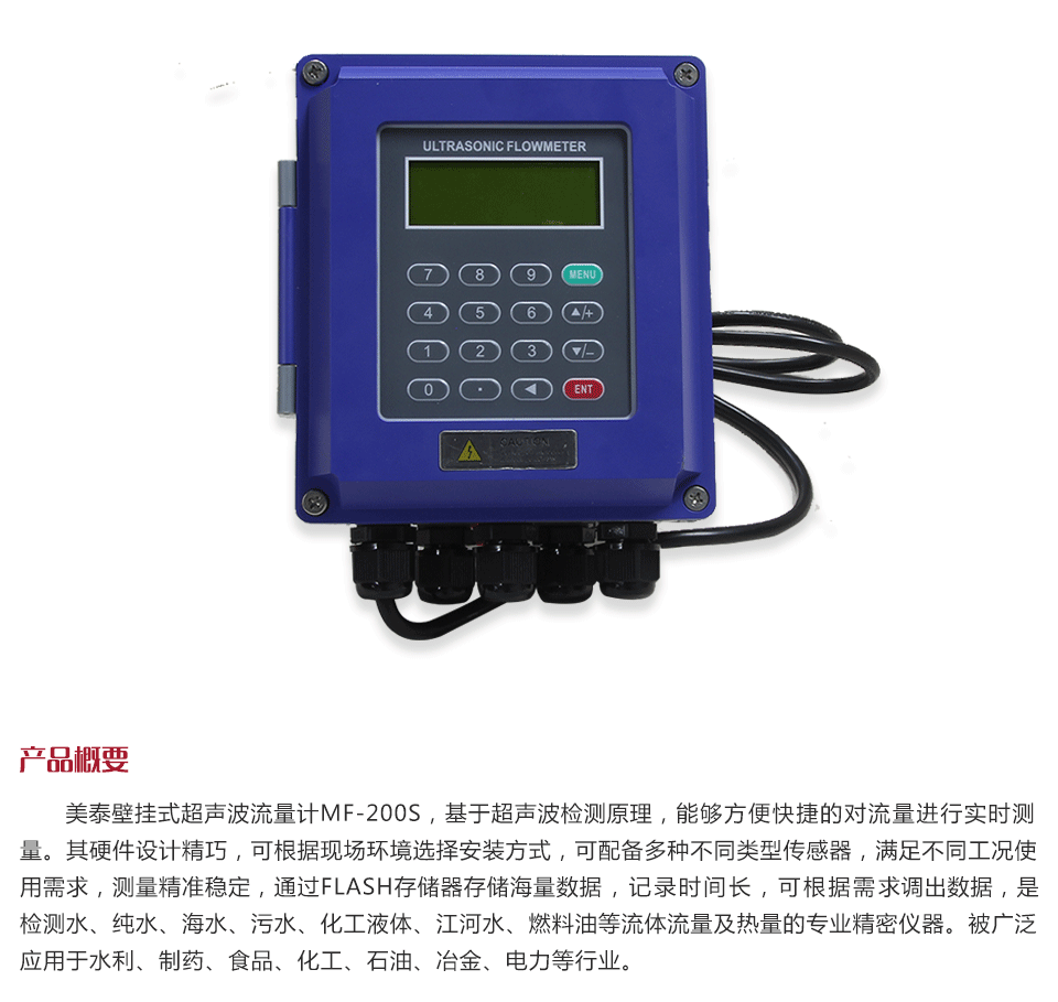 產(chǎn)品概述美泰壁掛式超聲波流量計(jì)MF-200S,基于超聲波檢測(cè)原理,能夠方便快捷的對(duì)流量進(jìn)行實(shí)時(shí)測(cè)量。其硬件設(shè)計(jì)精巧,可根據(jù)現(xiàn)場(chǎng)環(huán)境選擇安裝方式,可配備多種不同類(lèi)型傳感器,滿(mǎn)足不同工況使用需求,測(cè)量精準(zhǔn)穩(wěn)定,通過(guò)FLASH存儲(chǔ)器存儲(chǔ)海量數(shù)據(jù),記錄時(shí)間長(zhǎng),可根據(jù)需求調(diào)出數(shù)據(jù),是檢測(cè)水、純水、海水、污水、化工液體、江河水、燃料油等流體流量及熱量的專(zhuān)業(yè)精密儀器。被廣泛應(yīng)用于水利、制藥、食品、化工、石油、冶金、電力等行業(yè)。