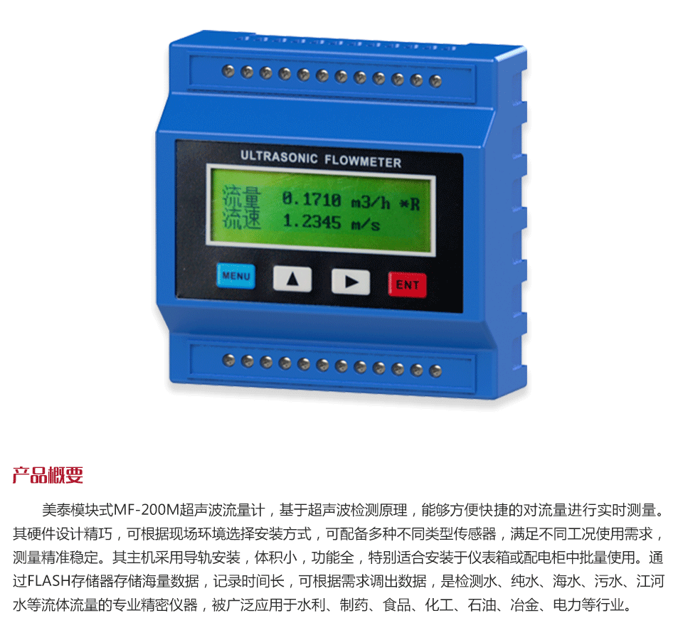 產(chǎn)品概述美泰模塊式MF-200M超聲波流量計(jì),基于超聲波檢測原理,能夠方便快捷的對流量進(jìn)行實(shí)時(shí)測量。其硬件設(shè)計(jì)精巧,可根據(jù)現(xiàn)場環(huán)境選擇安裝方式,可配備多種不同類型傳感器,滿足不同工況使用需求,測量精準(zhǔn)穩(wěn)定。其主機(jī)采用導(dǎo)軌安裝,體積小,功能全,特別適合安裝于儀表箱或配電柜中批量使用。通過FLASH存儲(chǔ)器存儲(chǔ)海量數(shù)據(jù),記錄時(shí)間長,可根據(jù)需求調(diào)出數(shù)據(jù),是檢測水、純水、海水、污水、、江河水等流體流量的專業(yè)精密儀器,被廣泛應(yīng)用于水利、制藥、食品、化工、石油、冶金、電力等行業(yè)。