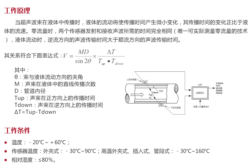 工作原理當(dāng)超聲波束在液體中傳播時(shí),液體的流動(dòng)將使傳播時(shí)間產(chǎn)生微小變化,其傳播時(shí)間的變化正比于液體的流速。零流量時(shí),兩個(gè)傳感器發(fā)射和接收聲波所需的時(shí)間完全相同(唯一可實(shí)際測量零流量的技術(shù)),液體流動(dòng)時(shí),逆流方向的聲波傳輸時(shí)間大于順流方向的聲波傳輸時(shí)間。