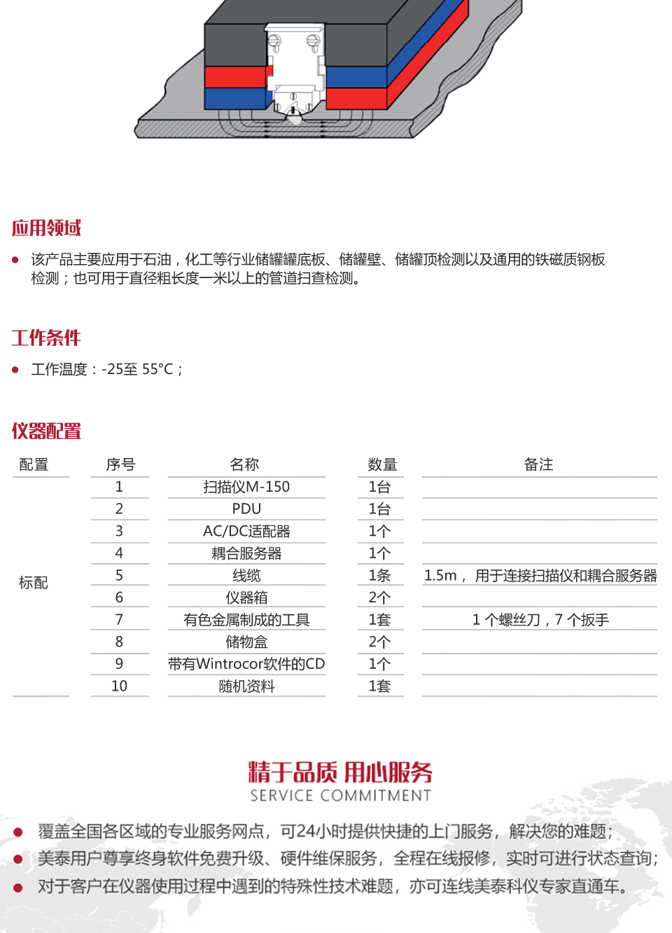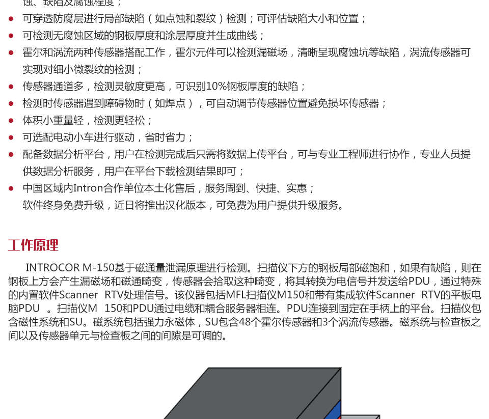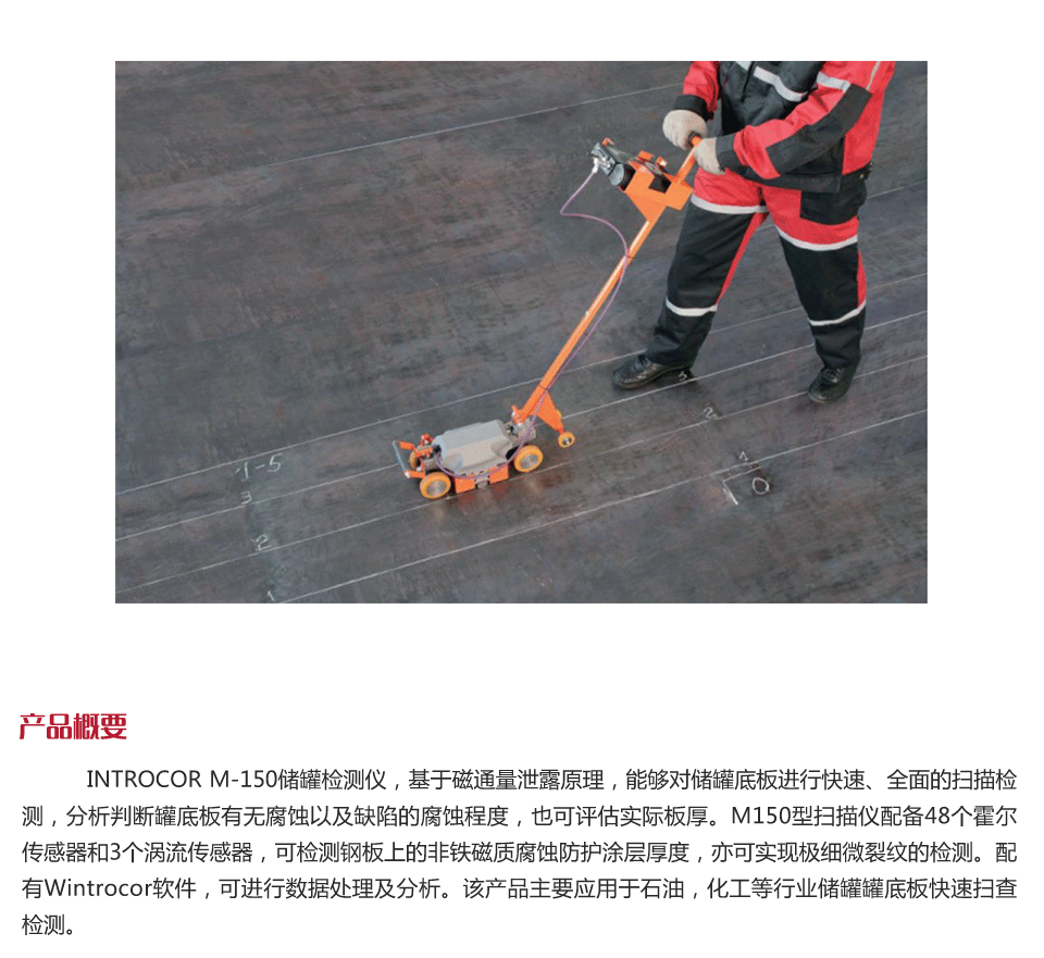 產(chǎn)品概述Intron M-150儲(chǔ)罐檢測(cè)儀,基于磁通量泄露原理,能夠?qū)?chǔ)罐底板進(jìn)行快速、全面的掃描檢測(cè),分析判斷罐底板有 無腐蝕以及缺陷的腐蝕程度,也可評(píng)估實(shí)際板厚。M150型掃描儀配備48個(gè)霍爾傳感器和3個(gè)渦流傳感器,可檢測(cè)鋼板上 的非鐵磁質(zhì)腐蝕防護(hù)涂層厚度,亦可實(shí)現(xiàn)極細(xì)微裂紋的檢測(cè)。配有Wintrocor軟件,可進(jìn)行數(shù)據(jù)處理及分析。該產(chǎn)品主 要應(yīng)用于石油,化工等行業(yè)儲(chǔ)罐罐底板快速掃查檢測(cè)。