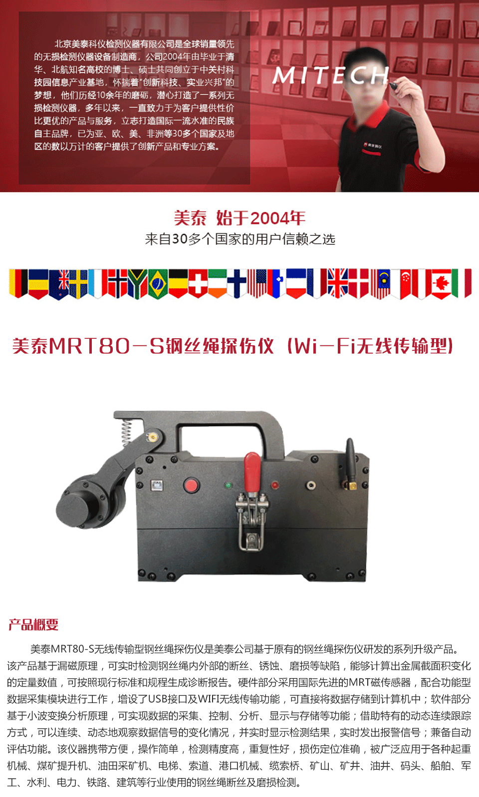 產(chǎn)品概述美泰MRT80-S無線傳輸型鋼絲繩探傷儀是美泰公司基于原有的鋼絲繩探傷儀研發(fā)的系列升級產(chǎn)品。該產(chǎn)品基于漏磁原理,可實時檢測鋼絲繩內(nèi)外部的斷絲、銹蝕、磨損等缺陷,能夠計算出金屬截面積變化的定量數(shù)值,可按照現(xiàn)行標(biāo)準(zhǔn)和規(guī)程生成診斷報告。硬件部分采用國際先進(jìn)的MRT磁傳感器,配合功能型數(shù)據(jù)采集模塊進(jìn)行工作,增設(shè)了USB接口及WIFI無線傳輸功能,可直接將數(shù)據(jù)存儲到計算機(jī)中;軟件部分基于小波變換分析原理,可實現(xiàn)數(shù)據(jù)的采集、控制、分析、顯示與存儲等功能;借助特有的動態(tài)連續(xù)跟蹤方式,可以連續(xù)、動態(tài)地觀察數(shù)據(jù)信號的變化情況,并實時顯示檢測結(jié)果,實時發(fā)出報警信號;兼?zhèn)渥詣釉u估功能。該儀器攜帶方便,操作簡單,檢測精度高,重復(fù)性好,損傷定位準(zhǔn)確,被廣泛應(yīng)用于各種起重機(jī)械、煤礦提升機(jī)、油田采礦機(jī)、電梯、索道、港口機(jī)械、纜索橋、礦山、礦井、油井、碼頭、船舶、軍工、水利、電力、鐵路、建筑等行業(yè)使用的鋼絲繩斷絲及磨損檢測。