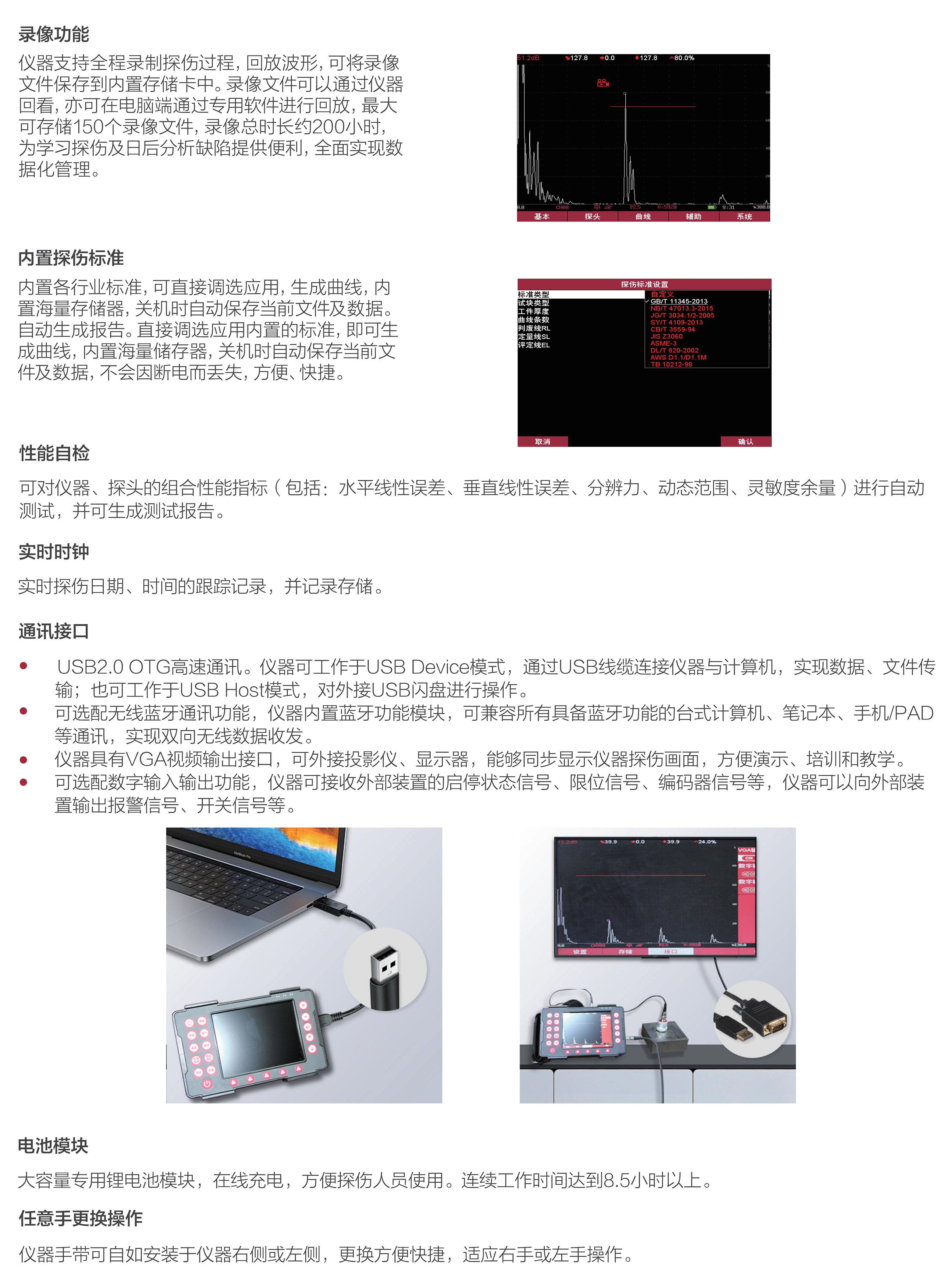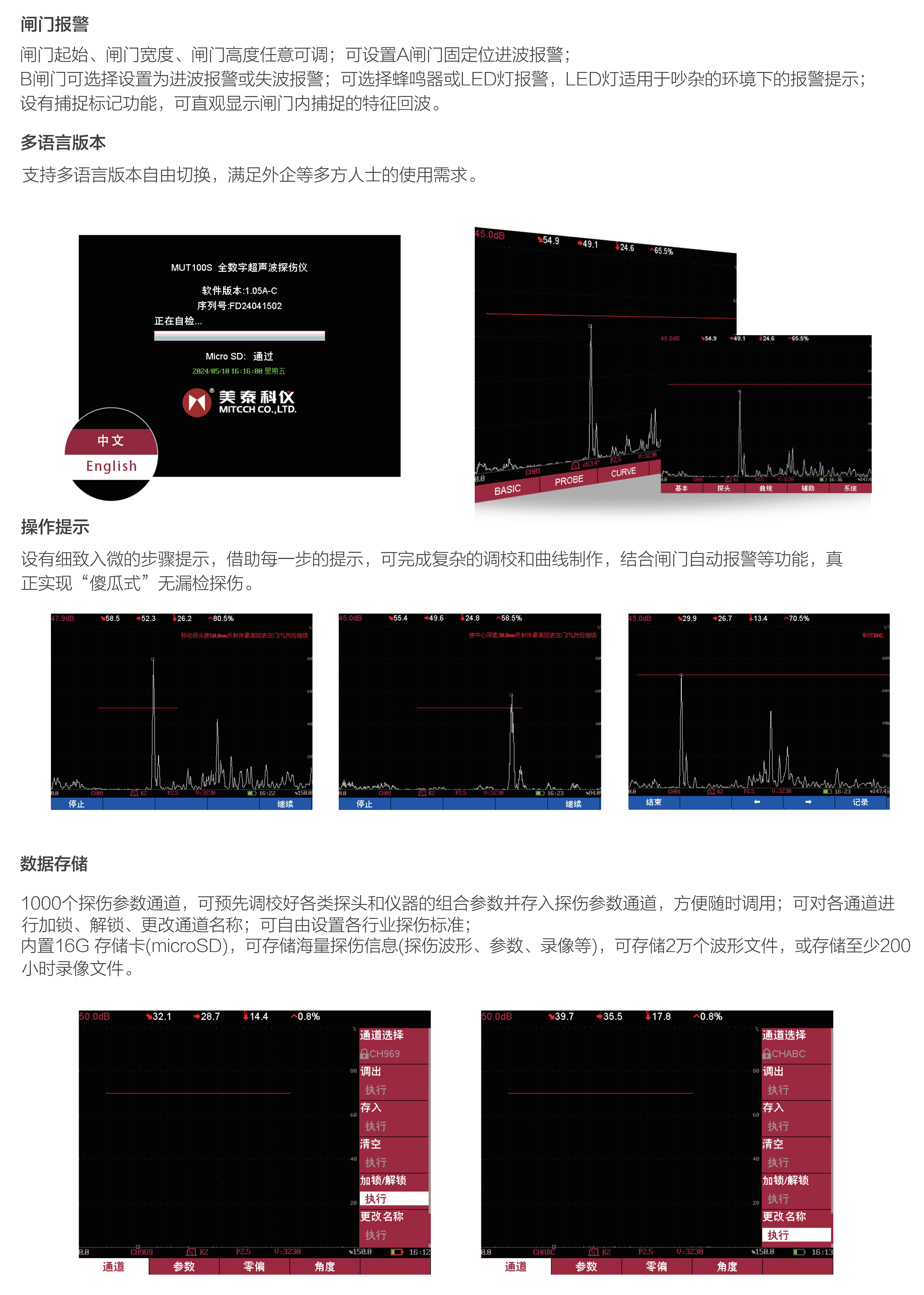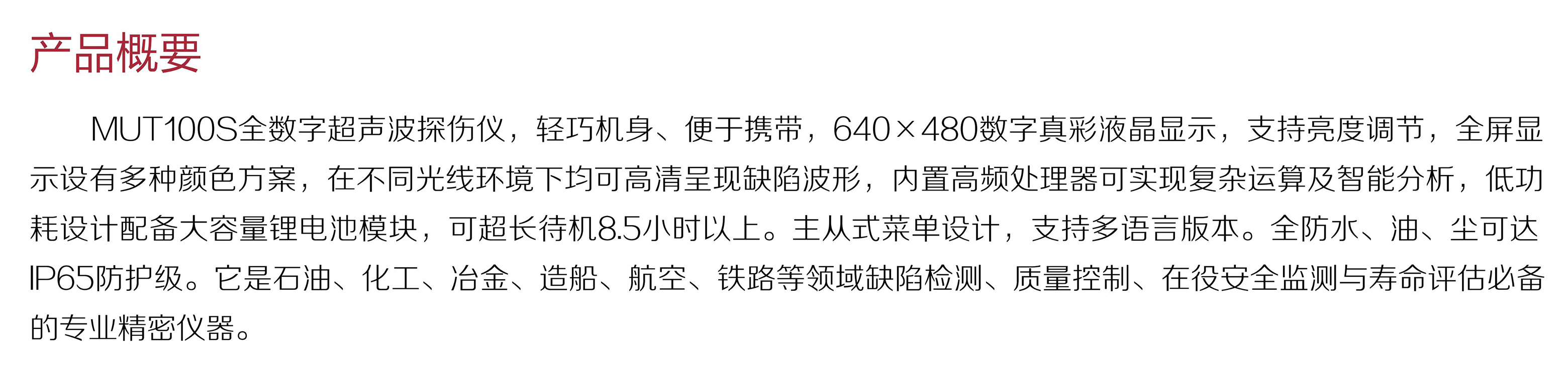 產(chǎn)品概述MUT100S全數(shù)字超聲波探傷儀,輕巧機(jī)身、便于攜帶,640×480數(shù)字真彩液晶顯示,支持亮度調(diào)節(jié),全屏顯示設(shè)有多種顏色方案,在不同光線環(huán)境下均可高清呈現(xiàn)缺陷波形,內(nèi)置高頻處理器可實(shí)現(xiàn)復(fù)雜運(yùn)算及智能分析,低功耗設(shè)計(jì)配備大容量鋰電池模塊,可超長(zhǎng)待機(jī)8.5小時(shí)以上。主從式菜單設(shè)計(jì),支持多語(yǔ)言版本。全防水、油、塵可達(dá)IP65防護(hù)級(jí)。它是石油、化工、冶金、造船、航空、鐵路等領(lǐng)域缺陷檢測(cè)、質(zhì)量控制、在役安全監(jiān)測(cè)與壽命評(píng)估必備的專業(yè)精密儀器。