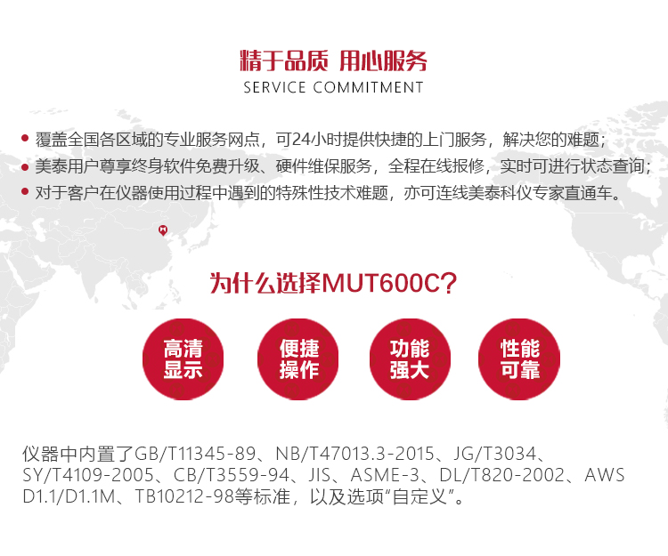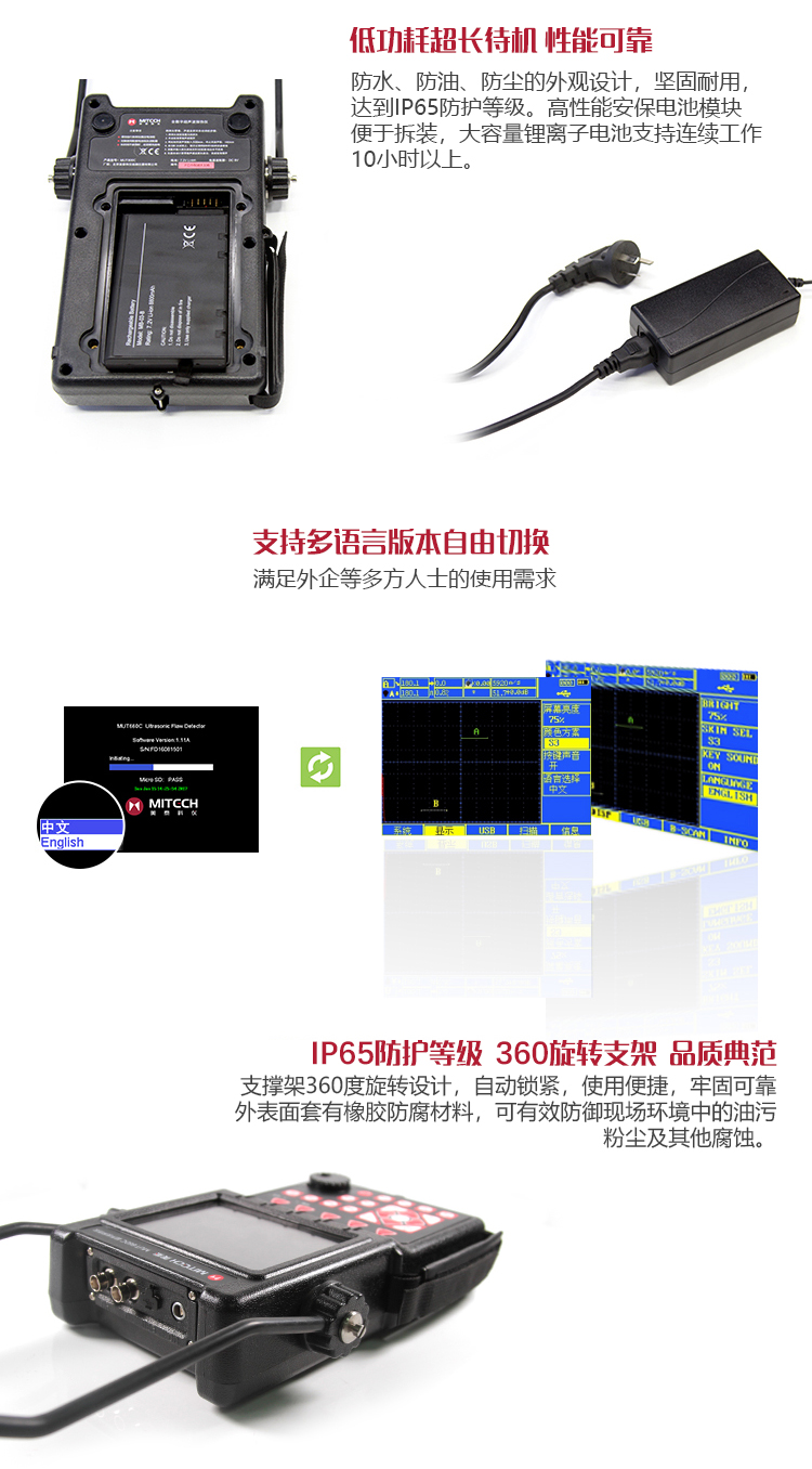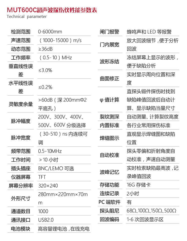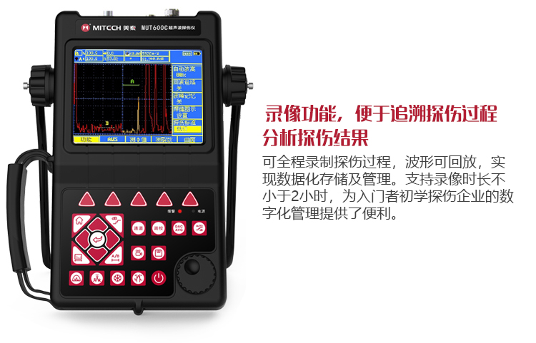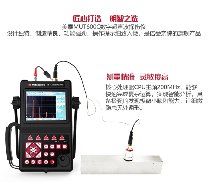 產(chǎn)品概述MUT600C數(shù)字式超聲波探傷儀基于超聲傳播原理,可精準(zhǔn)、靈敏地進(jìn)行工件內(nèi)部多種缺陷(裂紋、夾雜、氣孔等)的檢測(cè)、定位、評(píng)估和診斷。采用全數(shù)字TFT 320×240真彩色液晶顯示屏,可根據(jù)環(huán)境選擇操作界面風(fēng)格,液晶亮度可調(diào)節(jié),界面設(shè)計(jì)人性化、波形顯示細(xì)膩;可全屏清晰發(fā)現(xiàn)缺陷;單手可把持操作,曲線制作、探頭校準(zhǔn)等操作均可自動(dòng)完成;既可用以用于實(shí)驗(yàn)室,也可以用于工程現(xiàn)場(chǎng)。0-6000mm普通量程可滿(mǎn)足制造業(yè)、鋼鐵冶金業(yè)、金屬加工也、化工業(yè)等常規(guī)的缺陷檢測(cè)需求,低功耗設(shè)計(jì)配備大容量高性能鋰離子電池模塊可連續(xù)工作10小時(shí)以上;質(zhì)優(yōu)價(jià)廉,是實(shí)用經(jīng)濟(jì)款超聲檢測(cè)儀器的首選。