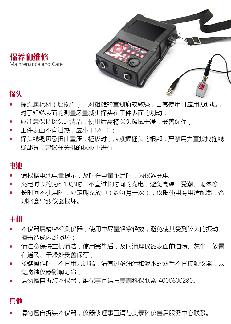 | 美泰超聲波探傷儀附有專(zhuān)用的隨機(jī)裝箱資料。包括產(chǎn)品合格證、保修卡、產(chǎn)品說(shuō)明書(shū)、裝箱清單。隨機(jī)資料采用專(zhuān)用的銅版紙印制,說(shuō)明書(shū)圖文設(shè)計(jì),美觀、易懂、便于長(zhǎng)久保存。注:美泰品牌系列產(chǎn)品的隨機(jī)資料均可登陸m.innitorpower.com下載電子版。 | |