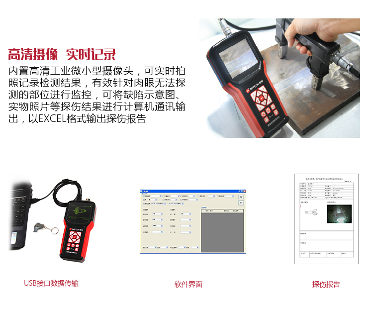 ?內(nèi)置工業(yè)高清微小型攝像頭,可實(shí)時(shí)拍照記錄檢測(cè)結(jié)果,有效針對(duì)肉眼無法檢測(cè)的部位進(jìn)行監(jiān)控,可將缺陷示意圖、實(shí)物照片等探傷結(jié)果進(jìn)行計(jì)算機(jī)通訊輸出,以Excel格式導(dǎo)出探傷報(bào)告。