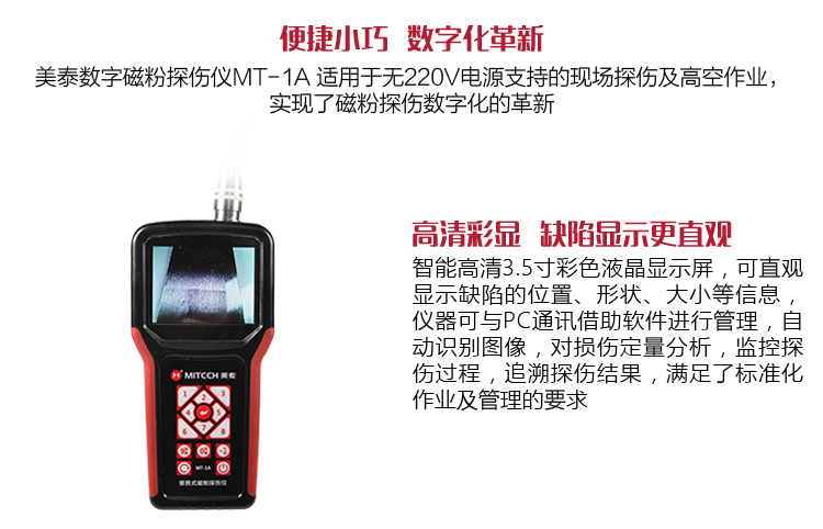 產(chǎn)品概述MT-1A型便攜式數(shù)字磁粉探傷儀,采用大容量鋰電池組供電,將充電電池提供的直流電經(jīng)過變頻逆變和信號(hào)移相處理,為磁粉探傷提供磁化電源,解決了傳統(tǒng)磁粉探傷儀依賴220V電源的弊端;功耗低,一次充電可連續(xù)工作4小時(shí)以上,電池可以在線充電和脫機(jī)充電??蓪?duì)探傷過程進(jìn)行實(shí)時(shí)監(jiān)控,具備圖像處理功能,可存儲(chǔ)數(shù)據(jù)、打印測(cè)試報(bào)告、跟蹤追溯探傷結(jié)果,滿足了標(biāo)準(zhǔn)化作業(yè)及管理的要求。特別適用于野外無電源的現(xiàn)場(chǎng)探傷及高空作業(yè),它實(shí)現(xiàn)了磁粉探傷數(shù)字化的革新。