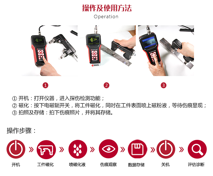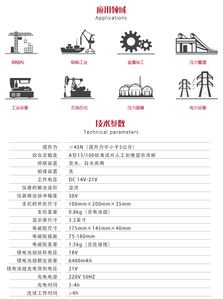 ?儀器可根據(jù)用戶要求及檢驗(yàn)部件的特殊性配置適用的電磁軛,儀器增設(shè)了自動(dòng)開工校驗(yàn)、儀器指標(biāo)測(cè)試等管理功能。