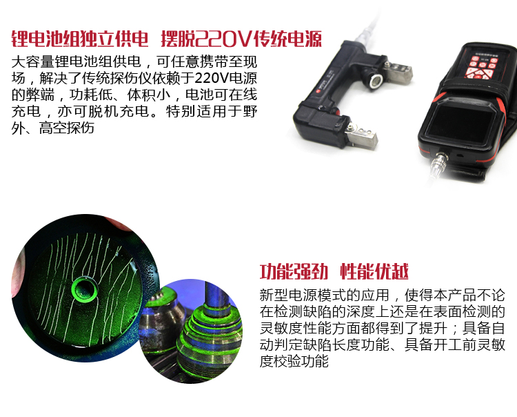 ?新型電源模式的應(yīng)用,使本產(chǎn)品不論在檢測(cè)缺陷的深度還是在表面檢測(cè)的靈敏度性能方面都得到了提升;具備自動(dòng)判定缺陷長(zhǎng)度功能、具備開工前靈敏度校驗(yàn)功能。