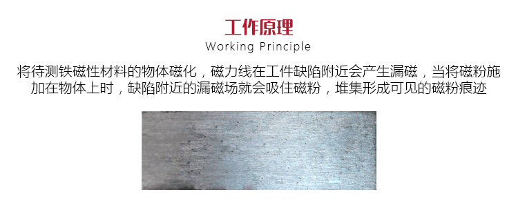 工作原理將待測(cè)鐵磁性材料的物體置于強(qiáng)磁場(chǎng)中或通以強(qiáng)大電流使之磁化,若物體表面或表面附近存有缺陷(裂紋、折疊、夾雜物等),磁力線在這些缺陷附近會(huì)產(chǎn)生漏磁,當(dāng)將導(dǎo)磁性良好的磁粉(通常為磁性氧化鐵粉)施加在物體上時(shí),缺陷附近的漏磁場(chǎng)就會(huì)吸住磁粉,堆集形成可見的磁粉痕跡,在合適的光照下形成可見的磁痕,從而顯示出連續(xù)性的位置、大小、形狀和嚴(yán)重程度,將缺陷顯示出來。