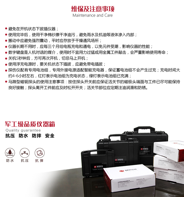儀器的保養(yǎng)與維護(hù)數(shù)字便攜式磁粉探傷儀屬于精密檢測(cè)儀器,使用中要注意下列事項(xiàng):