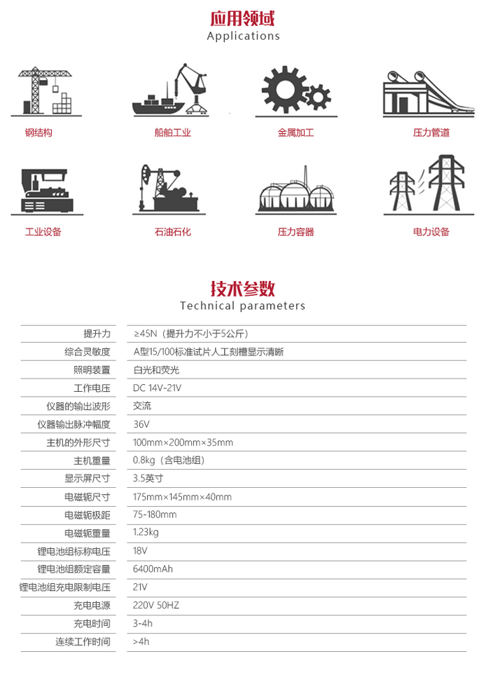 飛機制造、鍋爐壓力容器、電力、油田、造船、汽輪機和內(nèi)燃機配件、煤礦、機械、標(biāo)準(zhǔn)件、油泵油嘴、汽車零件、造橋、化工、鐵路、大型機械零部件、鋼結(jié)構(gòu)設(shè)備等行業(yè)產(chǎn)品;因鍛壓、淬火、焊接、疲勞等引起的表面及近表面缺陷,如鏈桿、曲軸、軸承、高強度螺栓、彈簧、鍛件、石化管件、閥門、葉片、齒輪、錨鏈以及焊縫等幾何形狀復(fù)雜的工件等。