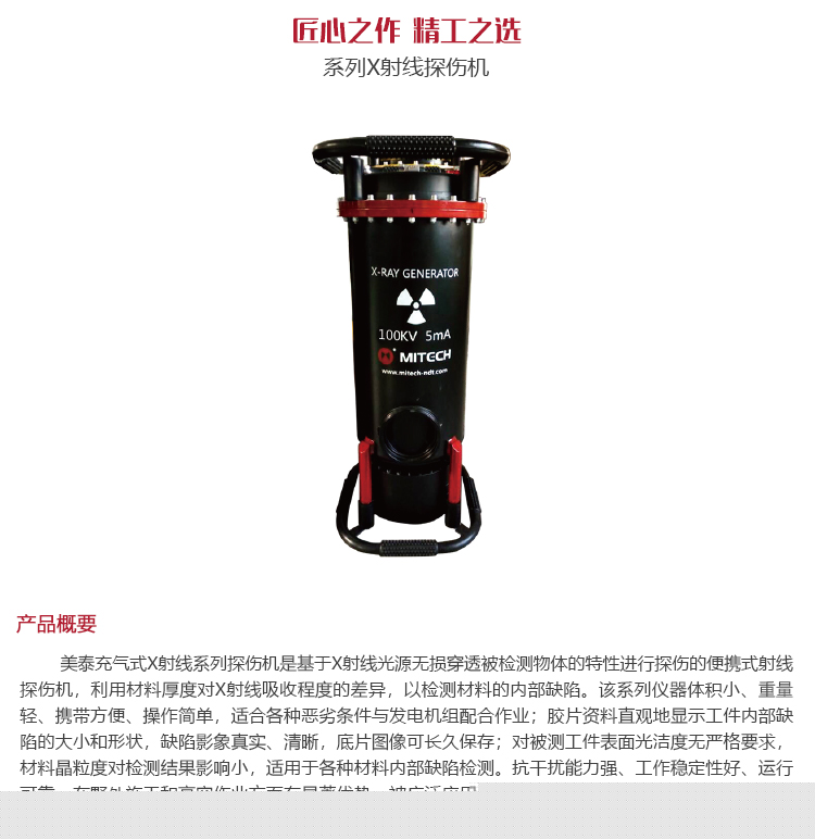 產(chǎn)品概述美泰XXQ-1605射線探傷儀是進行X射線無損探傷的便攜式射線探傷機,它利用材料厚度對X射線吸收程度的差異,以檢測材料的內(nèi)部缺陷。該系列儀器體積小、重量輕、攜帶方便、操作簡單,特別適合各種惡劣條件與發(fā)電機組配合作業(yè);底片可直觀地顯示工件內(nèi)部缺陷的大小和形狀,圖像可長久保存;體現(xiàn)在膠片上的缺陷影象真實、清晰;對被測工件表面光潔度無嚴格要求,材料晶粒度對檢測結(jié)果的影響小,適用于各種材料內(nèi)部缺陷檢測。該儀器干擾能力強、工作穩(wěn)定性好、運行可靠,特別適合野外施工和高空作業(yè),被廣泛應(yīng)用于造船、機械制造、航空、鐵路、壓力容器、鍋爐、石油、化工、國防工業(yè)等行業(yè),是進行無損探傷的理想設(shè)備。