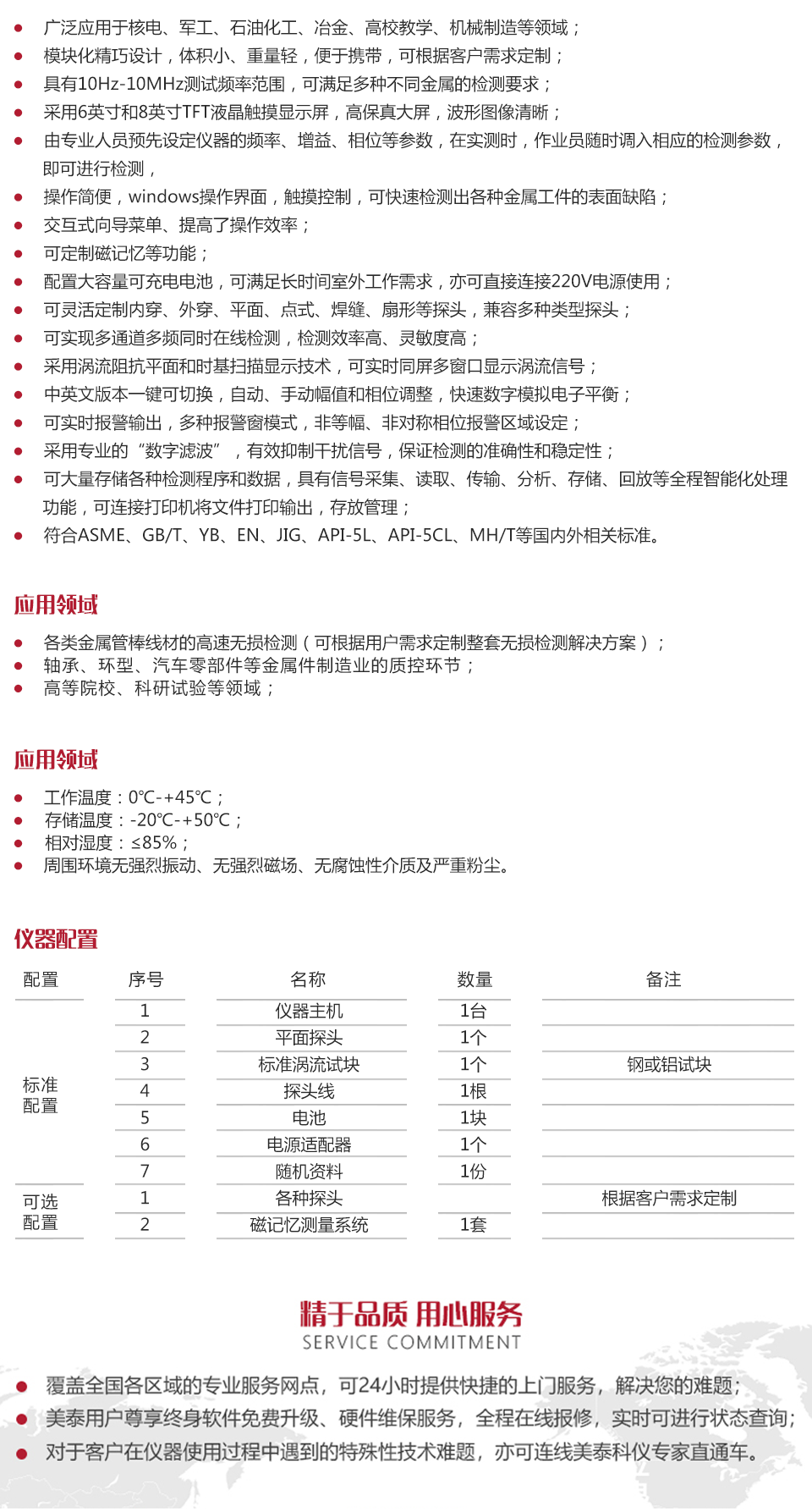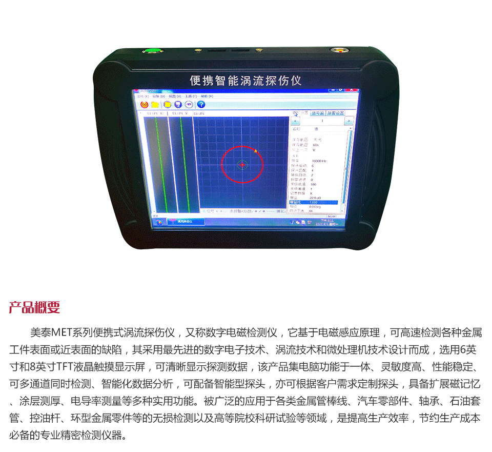 產(chǎn)品概述美泰MET系列便攜式渦流探傷儀,又稱數(shù)字電磁檢測儀,它基于電磁感應(yīng)原理,可高速檢測各種金屬工件表面或近表面的缺陷,其采用最先進(jìn)的數(shù)字電子技術(shù)、渦流技術(shù)和微處理機(jī)技術(shù)設(shè)計而成,選用6英寸和8英寸TFT液晶觸摸顯示屏,可清晰顯示探測數(shù)據(jù),該產(chǎn)品集電腦功能于一體、靈敏度高、性能穩(wěn)定、可多通道同時檢測、智能化數(shù)據(jù)分析,可配備智能型探頭,亦可根據(jù)客戶需求定制探頭,具備擴(kuò)展磁記憶、涂層測厚、電導(dǎo)率測量等多種實用功能。被廣泛的應(yīng)用于各類金屬管棒線、汽車零部件、軸承、石油套管、控油桿、環(huán)型金屬零件等的無損檢測以及高等院校科研試驗等領(lǐng)域,是提高生產(chǎn)效率,節(jié)約生產(chǎn)成本必備的專業(yè)精密檢測儀器。