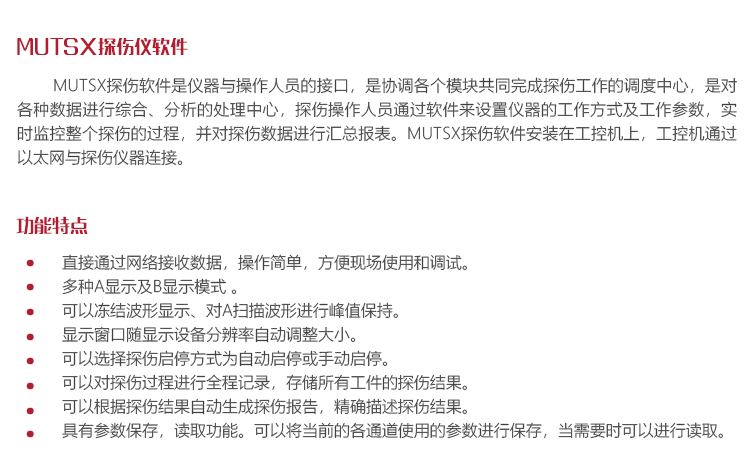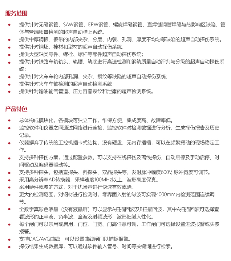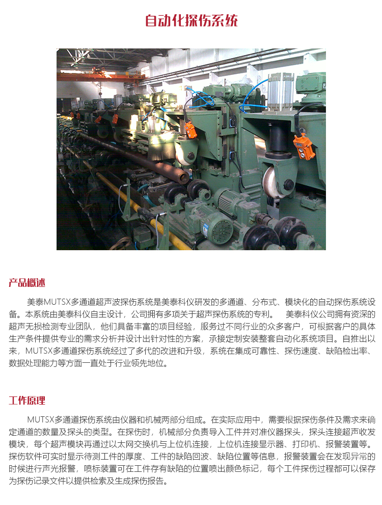 產(chǎn)品概述美泰MUTSX多通道超聲波探傷系統(tǒng)是美泰科儀研發(fā)的多通道、分布式、模塊化的自動探傷系統(tǒng)設(shè)備。本系統(tǒng)由美泰科儀自主設(shè)計,公司擁有多項關(guān)于超聲探傷系統(tǒng)的專利。 美泰科儀公司擁有資深的超聲無損檢測專業(yè)團隊,他們具備豐富的項目經(jīng)驗,服務(wù)過不同行業(yè)的眾多客戶,可根據(jù)客戶的具體生產(chǎn)條件提供專業(yè)的需求分析并設(shè)計出針對性的方案,承接定制安裝整套自動化系統(tǒng)項目。自推出以來,MUTSX多通道探傷系統(tǒng)經(jīng)過了多代的改進和升級,系統(tǒng)在集成可靠性、探傷速度、缺陷檢出率、數(shù)據(jù)處理能力等方面一直處于行業(yè)領(lǐng)先地位。