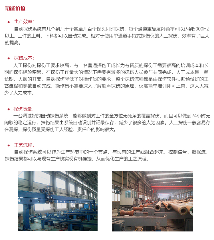 一臺調(diào)試好的自動探傷系統(tǒng),能夠做到對工件的全方位無死角的覆蓋探傷,而且可以做到24小時無間歇的穩(wěn)定運行,探傷結(jié)果由系統(tǒng)自動識別并記錄保存,減少了很多的人為因素。人工探傷一般容易存在漏探,探傷質(zhì)量受探傷工人經(jīng)驗、責(zé)任心的影響很大。