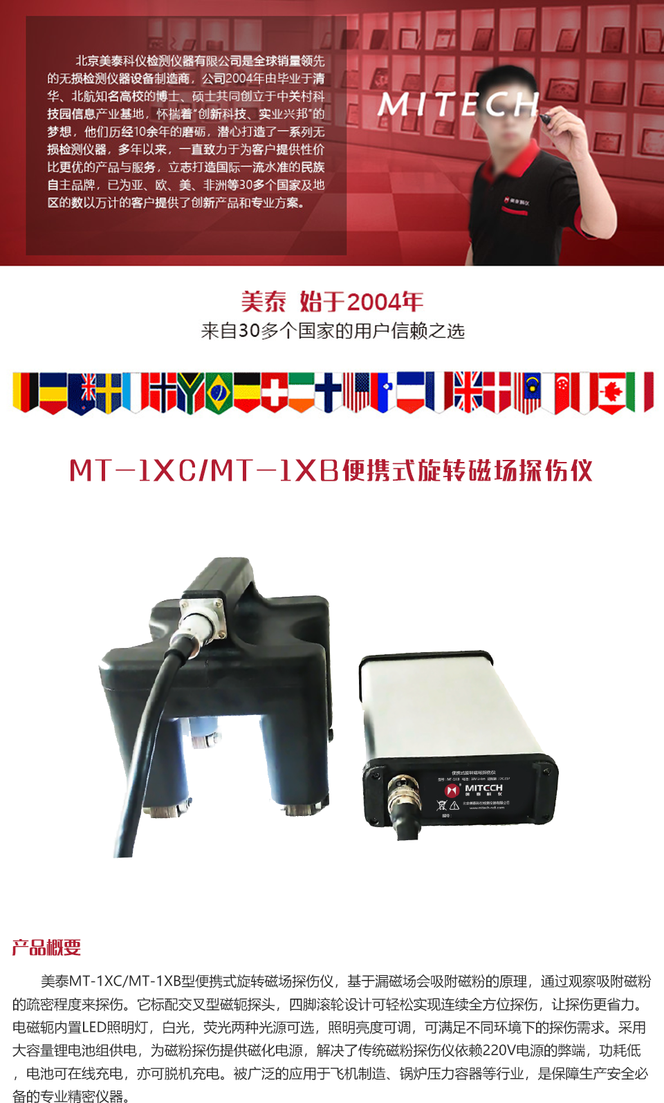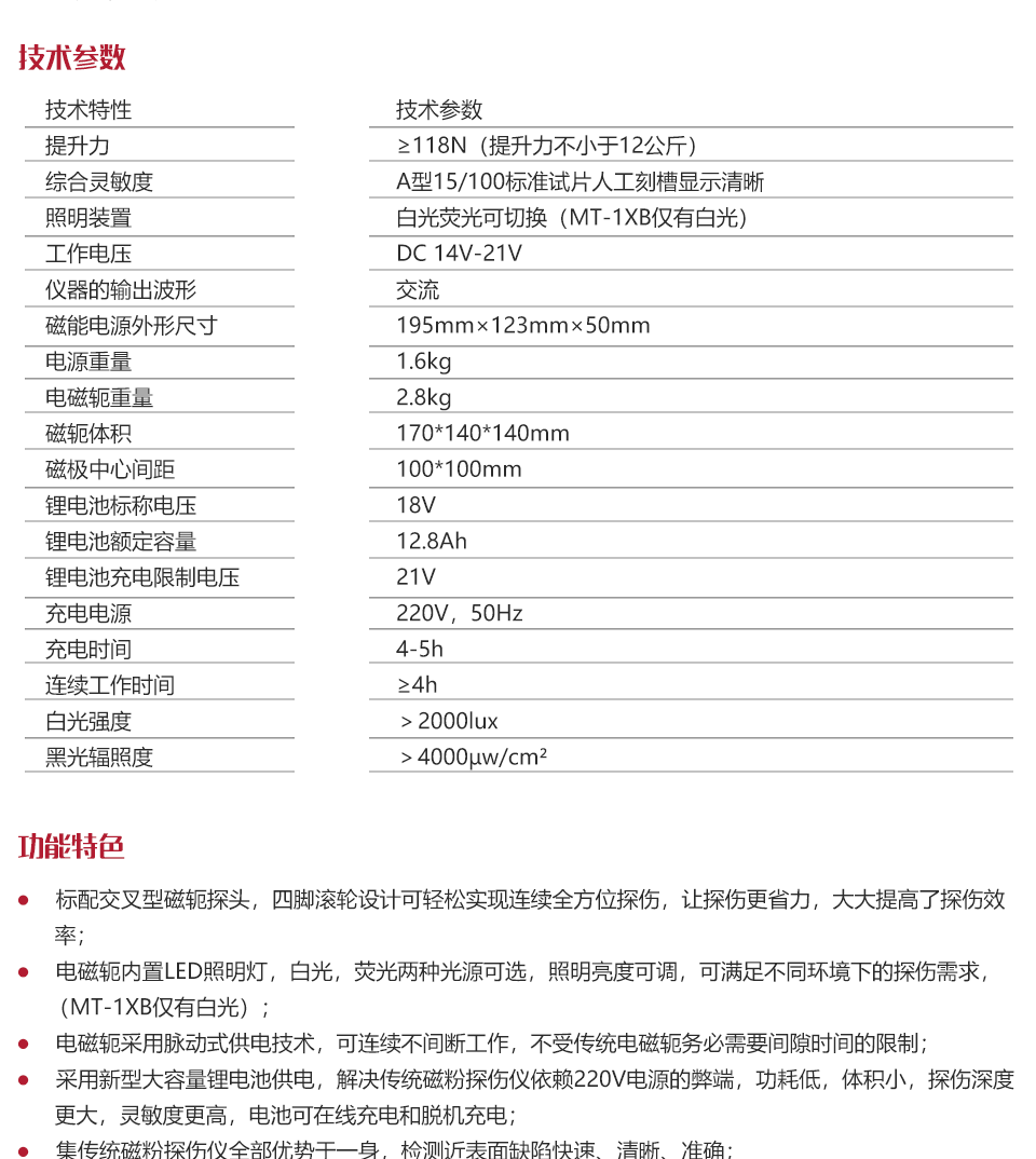產(chǎn)品概述美泰MT-1XC/MT-1XB型便攜式旋轉(zhuǎn)磁場(chǎng)探傷儀,基于漏磁場(chǎng)會(huì)吸附磁粉的原理,通過觀察吸附磁粉的疏密程度來(lái)探傷。它標(biāo)配交叉型磁軛探頭,四腳滾輪設(shè)計(jì)可輕松實(shí)現(xiàn)連續(xù)全方位探傷,讓探傷更省力。電磁軛內(nèi)置LED照明燈,白光,熒光兩種光源可選,照明亮度可調(diào),可滿足不同環(huán)境下的探傷需求。采用大容量鋰電池組供電,為磁粉探傷提供磁化電源,解決了傳統(tǒng)磁粉探傷儀依賴220V電源的弊端,功耗低,電池可在線充電,亦可脫機(jī)充電。被廣泛的應(yīng)用于飛機(jī)制造、鍋爐壓力容器等行業(yè),是保障生產(chǎn)安全必備的專業(yè)精密儀器。