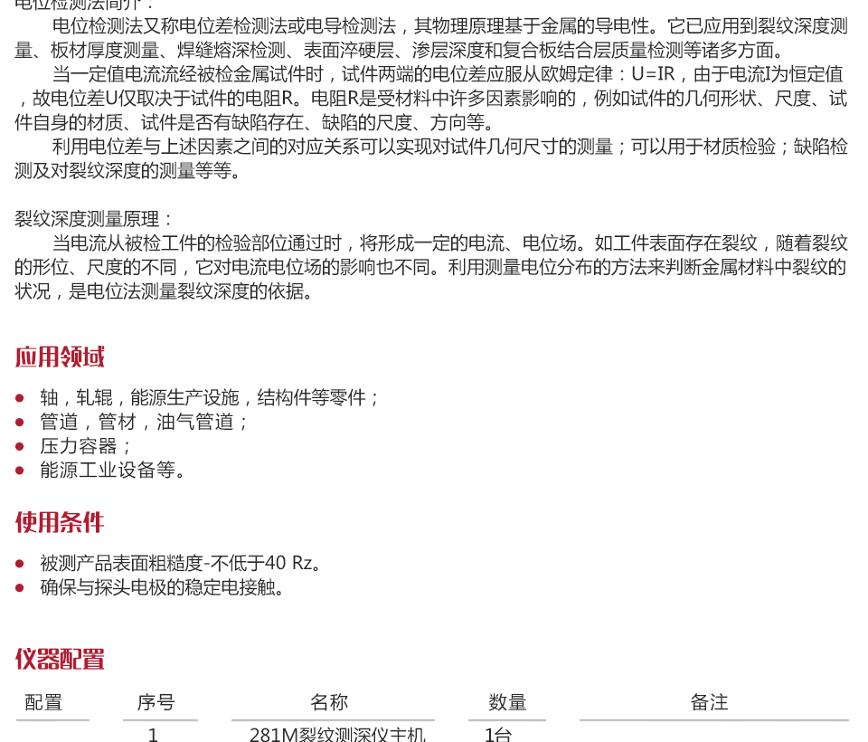 利用電位差與上述因素之間的對(duì)應(yīng)關(guān)系可以實(shí)現(xiàn)對(duì)試件幾何尺寸的測(cè)量;可以用于材質(zhì)檢驗(yàn);缺陷檢測(cè)及對(duì)裂紋深度的測(cè)量等等。