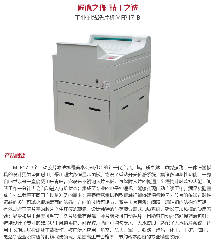 產(chǎn)品概述MFP17-B全自動膠片沖洗機是美泰公司推出的新一代產(chǎn)品,其品質(zhì)卓越、功能強勁,一體注塑模具的設(shè)計更為堅固耐用,采用超大數(shù)碼顯示面板,增設(shè)了微動開關(guān)傳感系統(tǒng),集諸多創(chuàng)新性功能于一身,自問世以來一直倍受用戶青睞。它設(shè)有不銹鋼入片托板,可保障入片的暢通;全程倒計時監(jiān)控功能,間斷工作一分鐘內(nèi)會自動進入待機狀態(tài);集成了專業(yè)的電子控速機,能夠?qū)崿F(xiàn)自動連續(xù)工作,滿足實驗室或戶外車載等不同用戶批量沖洗的需求;高強度密集排列型輥軸組能夠確保各種尺寸膠片的傳送;定時性運轉(zhuǎn)的設(shè)計可減少輥軸表面的結(jié)晶;方向的過橋可調(diào)節(jié),避免卡片現(xiàn)象;間隔、輥軸組的結(jié)構(gòu)均可調(diào),有效規(guī)避不同片基的膠片產(chǎn)生壓痕的現(xiàn)象;設(shè)計獨特的與藥液分離式加熱系統(tǒng),延長了加熱棒的使用壽命;顯影和烘干溫度可調(diào)節(jié),洗片質(zhì)量有保障;沖片藥液可自動循環(huán),且能夠自動補充,確保藥液新鮮;特別設(shè)計了專業(yè)的雛形烘干風(fēng)道系統(tǒng),確保膠片兩面可均勻受風(fēng),無水跡印;選配了無水循環(huán)系統(tǒng),適用于長期現(xiàn)場檢測及車載操作。被廣泛地應(yīng)用于航空、航天、軍工、鐵路、造船、化工、工礦、油田、電站等企業(yè)及商檢等射線探傷領(lǐng)域,是提高生產(chǎn)合格率、節(jié)約成本必備的專業(yè)精密儀器。