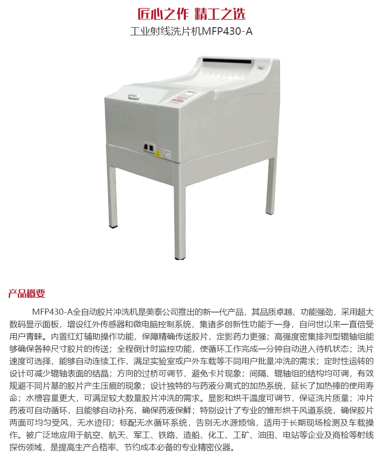 產(chǎn)品概述MFP430-A全自動(dòng)膠片沖洗機(jī)是美泰公司推出的新一代產(chǎn)品,其品質(zhì)卓越、功能強(qiáng)勁,采用超大數(shù)碼顯示面板,增設(shè)紅外傳感器和微電腦控制系統(tǒng),集諸多創(chuàng)新性功能于一身,自問世以來一直倍受用戶青睞。內(nèi)置紅燈輔助操作功能,保障精確傳送膠片,定影藥力更強(qiáng);高強(qiáng)度密集排列型輥軸組能夠確保各種尺寸膠片的傳送;全程倒計(jì)時(shí)監(jiān)控功能,使循環(huán)工作完成一分鐘自動(dòng)進(jìn)入待機(jī)狀態(tài);洗片速度可選擇,能夠自動(dòng)連續(xù)工作,滿足實(shí)驗(yàn)室或戶外車載等不同用戶批量沖洗的需求;定時(shí)性運(yùn)轉(zhuǎn)的設(shè)計(jì)可減少輥軸表面的結(jié)晶;方向的過橋可調(diào)節(jié),避免卡片現(xiàn)象;間隔、輥軸組的結(jié)構(gòu)均可調(diào),有效規(guī)避不同片基的膠片產(chǎn)生壓痕的現(xiàn)象;設(shè)計(jì)獨(dú)特的與藥液分離式的加熱系統(tǒng),延長(zhǎng)了加熱棒的使用壽命;水槽容量更大,可滿足較大數(shù)量膠片沖洗的需求。顯影和烘干溫度可調(diào)節(jié),保證洗片質(zhì)量;沖片藥液可自動(dòng)循環(huán),且能夠自動(dòng)補(bǔ)充,確保藥液保鮮;特別設(shè)計(jì)了專業(yè)的雛形烘干風(fēng)道系統(tǒng),確保膠片兩面可均勻受風(fēng),無水跡?。粯?biāo)配無水循環(huán)系統(tǒng),告別無水源煩惱,適用于長(zhǎng)期現(xiàn)場(chǎng)檢測(cè)及車載操作。被廣泛地應(yīng)用于航空、航天、軍工、鐵路、造船、化工、工礦、油田、電站等企業(yè)及商檢等射線探傷領(lǐng)域,是提高生產(chǎn)合格率、節(jié)約成本必備的專業(yè)精密儀器。