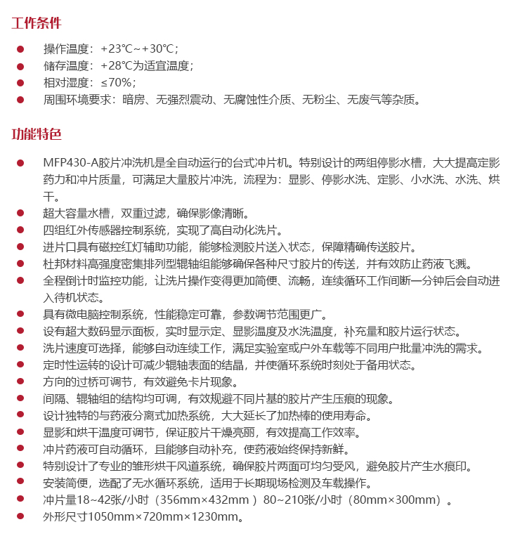 儀器特點(diǎn)MFP430-A膠片沖洗機(jī)是全自動(dòng)運(yùn)行的臺(tái)式?jīng)_片機(jī)。特別設(shè)計(jì)的兩組停影水槽,大大提高定影藥力和沖片質(zhì)量,可滿足大量膠片