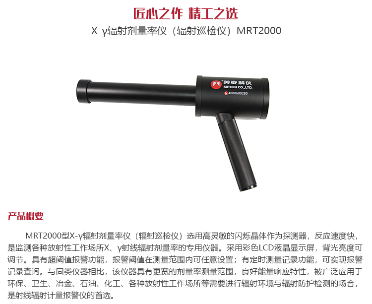 MRT2000型X-γ輻射劑量率儀(輻射巡檢儀) 選用高靈敏的閃爍晶體作為探測器,反應(yīng)速度快,是監(jiān)測各種放射性工作場所X、γ射線輻射劑量率的專用儀器。采用彩色LCD液晶顯示屏,背光亮度可調(diào)節(jié)。具有超閾值報(bào)警功能,報(bào)警閾值在測量范圍內(nèi)可任意設(shè)置;有定時(shí)測量記錄功能,可實(shí)現(xiàn)報(bào)警記錄查詢。與同類儀器相比,該儀器具有更寬的劑量率測量范圍,良好能量響應(yīng)特性,被廣泛應(yīng)用于環(huán)保、衛(wèi)生、冶金、石油、化工、各種放射性工作場所等需要進(jìn)行輻射環(huán)境與輻射防護(hù)檢測的場合,是射線輻射計(jì)量報(bào)警儀的首選。