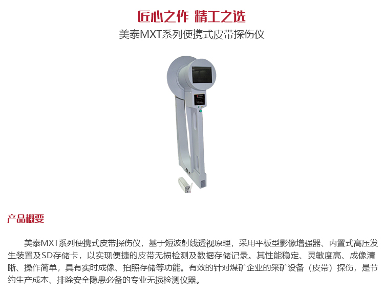 產(chǎn)品概述美泰MXT系列便攜式皮帶探傷儀,基于短波射線透視原理,采用平板型影像增強(qiáng)器、內(nèi)置式高壓發(fā)生裝置及SD存儲(chǔ)卡,以實(shí)現(xiàn)便捷的皮帶無損檢測及數(shù)據(jù)存儲(chǔ)記錄。其性能穩(wěn)定、靈敏度高、成像清晰、操作簡單,具有實(shí)時(shí)成像、拍照存儲(chǔ)等功能。有效的針對(duì)煤礦企業(yè)的采礦設(shè)備(皮帶)探傷,是節(jié)約生產(chǎn)成本、排除安全隱患必備的專業(yè)無損檢測儀器。
