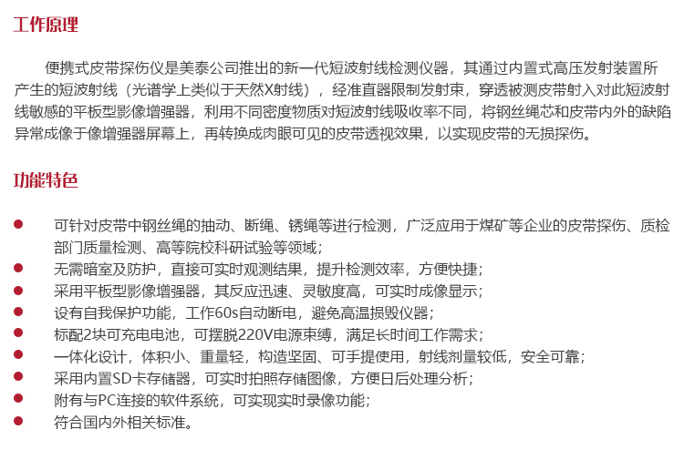工作原理便攜式皮帶探傷儀是美泰公司推出的新一代短波射線檢測儀器,其通過內(nèi)置式高壓發(fā)射裝置所產(chǎn)生的短波射線(光譜學(xué)上類似于天然X射線),經(jīng)準(zhǔn)直器限制發(fā)射束,穿透被測皮帶射入對(duì)此短波射線敏感的平板型影像增強(qiáng)器,利用不同密度物質(zhì)對(duì)短波射線吸收率不同,將鋼絲繩芯和皮帶內(nèi)外的缺陷異常成像于像增強(qiáng)器屏幕上,再轉(zhuǎn)換成肉眼可見的皮帶透視效果,以實(shí)現(xiàn)皮帶的無損探傷。