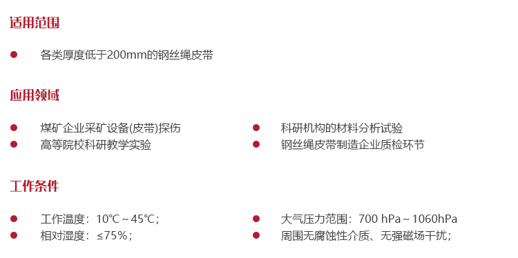 儀器特點(diǎn)可針對(duì)皮帶中鋼絲繩的抽動(dòng)、斷繩、銹繩等進(jìn)行檢測,廣泛應(yīng)用于煤礦等企業(yè)的皮帶探傷、質(zhì)檢部門質(zhì)量檢測、高等院校科研試驗(yàn)等領(lǐng)域;