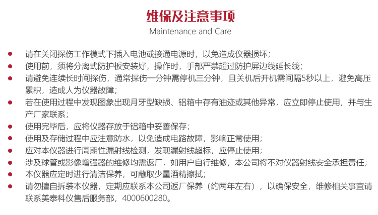 涉及球管或影像增強(qiáng)器的維修均需返廠,如用戶自行維修,本公司將不對(duì)儀器射線安全承擔(dān)責(zé)任;