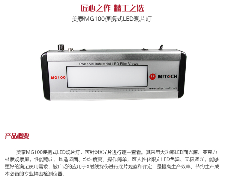 產(chǎn)品概述美泰MG100便攜式LED觀片燈,可針對(duì)X光片進(jìn)行逐一查看。其采用大功率LED面光源、亞克力材質(zhì)觀察屏,性能穩(wěn)定、構(gòu)造堅(jiān)固、均勻度高、操作簡(jiǎn)單,可人性化限定LED色溫、無(wú)極調(diào)光,能夠更好的滿足使用需求,被廣泛的應(yīng)用于X射線探傷進(jìn)行底片觀察和評(píng)定,是提高生產(chǎn)效率、節(jié)約生產(chǎn)成本必備的專業(yè)精密檢測(cè)儀器。