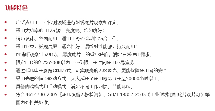 符合JB/T4730-2005《承壓設(shè)備無(wú)損檢測(cè)》、GB/T 19802-2005《工業(yè)射線照相底片觀片燈》等國(guó)內(nèi)外相關(guān)標(biāo)準(zhǔn)。