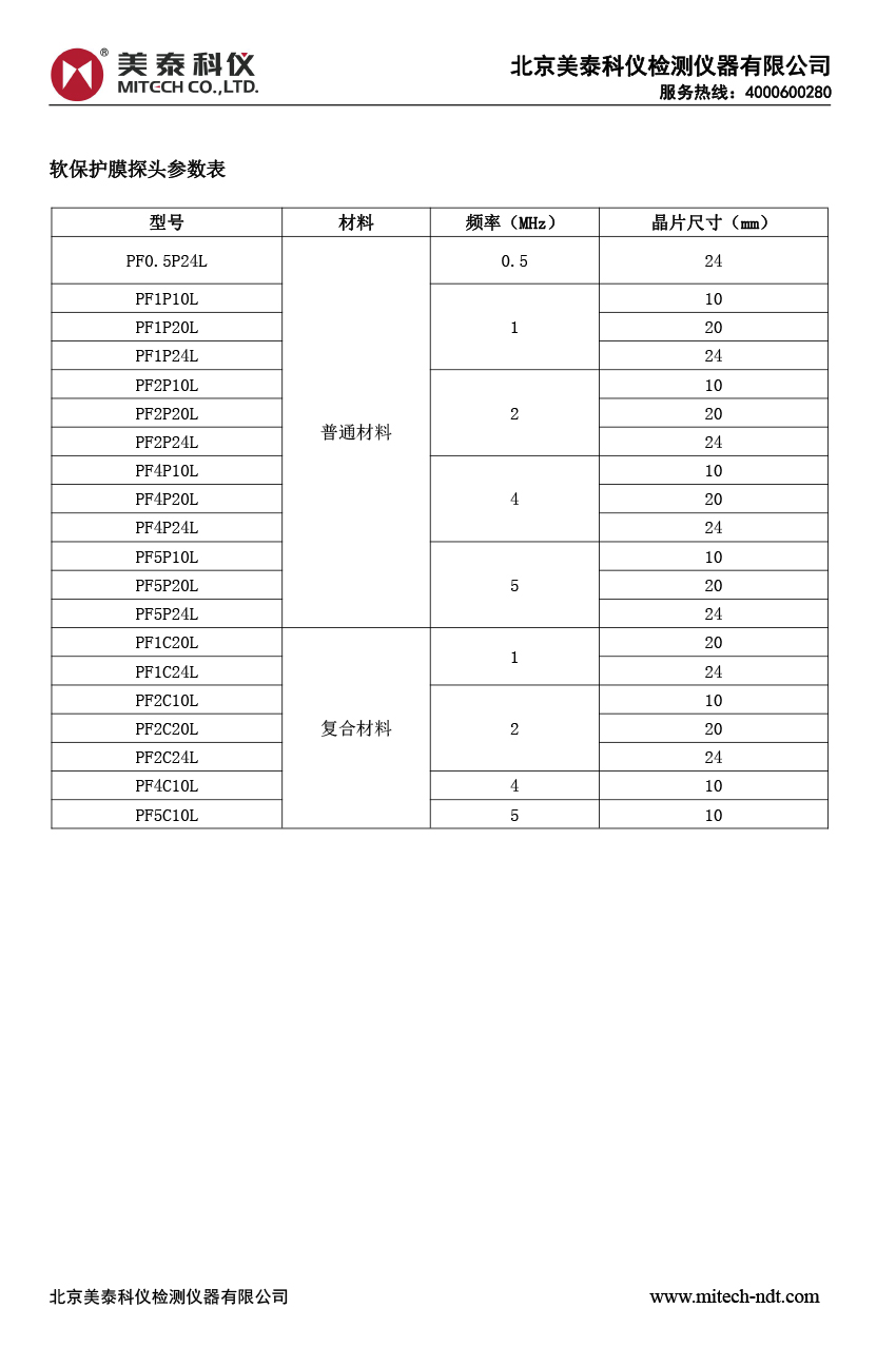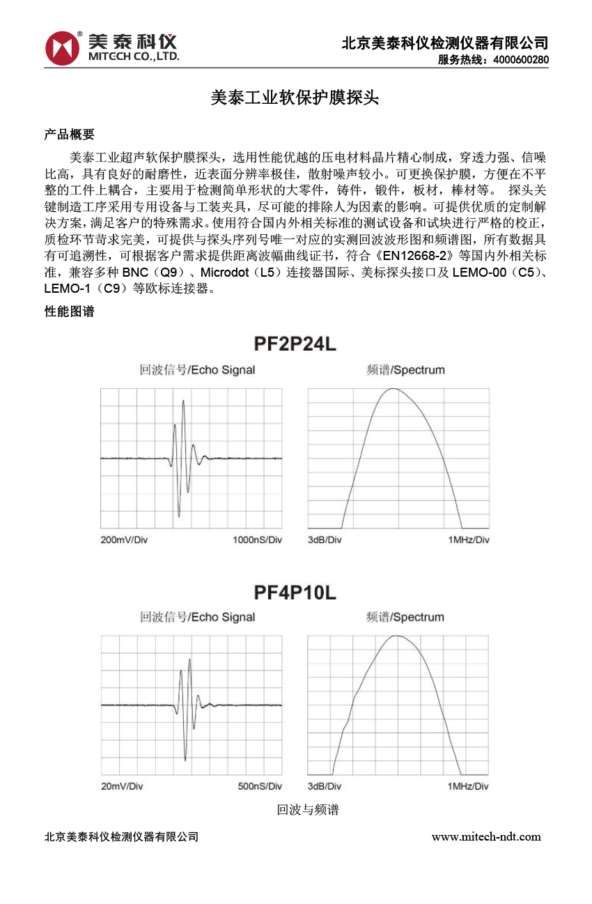 產(chǎn)品概述美泰工業(yè)超聲軟保護(hù)膜探頭,選用性能優(yōu)越的壓電材料晶片精心制成,穿透力強(qiáng)、信噪比高,具有良好的耐磨性,近表面分辨率極佳,散射噪聲較小??筛鼡Q保護(hù)膜,方便在不平整的工件上耦合,主要用于檢測(cè)簡(jiǎn)單形狀的大零件,鑄件,鍛件,板材,棒材等。 探頭關(guān)鍵制造工序采用專用設(shè)備與工裝夾具,盡可能的排除人為因素的影響??商峁﹥?yōu)質(zhì)的定制解決方案,滿足客戶的特殊需求。使用符合國(guó)內(nèi)外相關(guān)標(biāo)準(zhǔn)的測(cè)試設(shè)備和試塊進(jìn)行嚴(yán)格的校正,質(zhì)檢環(huán)節(jié)苛求完美,可提供與探頭序列號(hào)唯一對(duì)應(yīng)的實(shí)測(cè)回波波形圖和頻譜圖,所有數(shù)據(jù)具有可追溯性,可根據(jù)客戶需求提供距離波幅曲線證書(shū),符合《EN12668-2》等國(guó)內(nèi)外相關(guān)標(biāo)準(zhǔn),兼容多種LEMO-00(C5)、LEMO-1(C9)連接器。