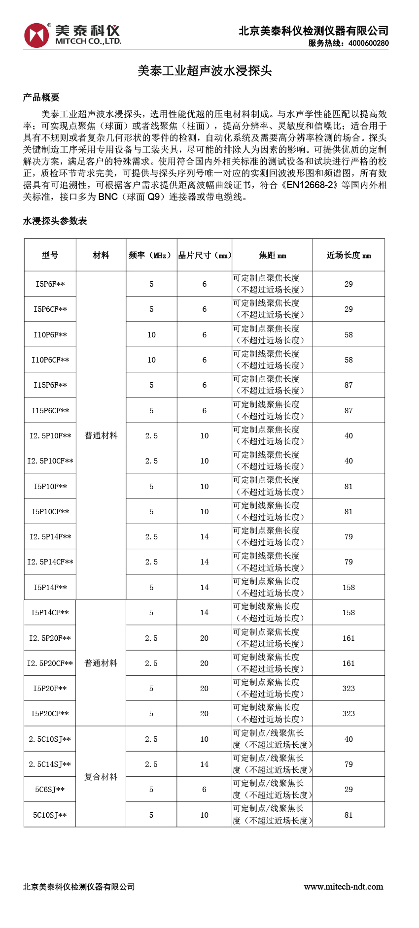 產品概述美泰工業(yè)超聲波水浸探頭,選用性能優(yōu)越的壓電材料制成。與水聲學性能匹配以提高效率;可實現(xiàn)點聚焦(球面)或者線聚焦(柱面),提高分辨率、靈敏度和信噪比;接口多為BNC(球面Q9)連接器或帶電纜線;適合用于具有不規(guī)則或者復雜幾何形狀的零件的檢測,自動化系統(tǒng)及需要高分辨率檢測的場合。探頭關鍵制造工序采用專用設備與工裝夾具,盡可能的排除人為因素的影響。可提供優(yōu)質的定制解決方案,滿足客戶的特殊需求。使用符合國內外相關標準的測試設備和試塊進行嚴格的校正,質檢環(huán)節(jié)苛求完美,可提供與探頭序列號唯一對應的實測回波波形圖和頻譜圖,所有數據具有可追溯性,可根據客戶需求提供距離波幅曲線證書,符合《EN12668-2》等國內外相關標準