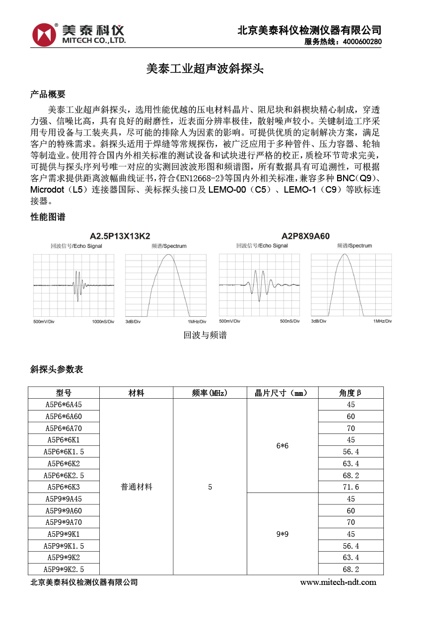 產(chǎn)品概述美泰工業(yè)超聲斜探頭,選用性能優(yōu)越的壓電材料晶片、阻尼塊和斜楔塊精心制成,穿透力強(qiáng)、信噪比高,具有良好的耐磨性,近表面分辨率極佳,散射噪聲較小。關(guān)鍵制造工序采用專用設(shè)備與工裝夾具,盡可能的排除人為因素的影響。可提供優(yōu)質(zhì)的定制解決方案,滿足客戶的特殊需求。斜探頭適用于焊縫等常規(guī)探傷,被廣泛應(yīng)用于多種管件、壓力容器、輪軸等制造業(yè)。使用符合國內(nèi)外相關(guān)標(biāo)準(zhǔn)的測(cè)試設(shè)備和試塊進(jìn)行嚴(yán)格的校正,質(zhì)檢環(huán)節(jié)苛求完美,可提供與探頭序列號(hào)唯一對(duì)應(yīng)的實(shí)測(cè)回波波形圖和頻譜圖,所有數(shù)據(jù)具有可追溯性,可根據(jù)客戶需求提供距離波幅曲線證書,符合《EN12668-2》等國內(nèi)外相關(guān)標(biāo)準(zhǔn),兼容多種BNC(Q9)、Microdot(L5)連接器國際、美標(biāo)探頭接口及LEMO-00(C5)、LEMO-1(C9)等歐標(biāo)連接器。