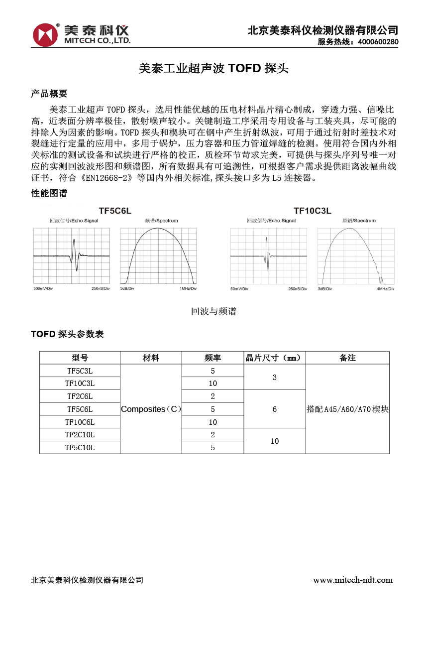 美泰工業(yè)超聲TOFD探頭,選用性能優(yōu)越的壓電材料晶片精心制成,穿透力強、信噪比高,近表面分辨率極佳,散射噪聲較小。關鍵制造工序采用專用設備與工裝夾具,盡可能的排除人為因素的影響。TOFD探頭和楔塊可在鋼中產生折射縱波,可用于通過衍射時差技術對裂縫進行定量的應用中,多用于鍋爐,壓力容器和壓力管道焊縫的檢測。使用符合國內外相關標準的測試設備和試塊進行嚴格的校正,質檢環(huán)節(jié)苛求完美,可提供與探頭序列號唯一對應的實測回波波形圖和頻譜圖,所有數據具有可追溯性,可根據客戶需求提供距離波幅曲線證書,符合《EN12668-2》等國內外相關標準,探頭接口多為L5連接器。