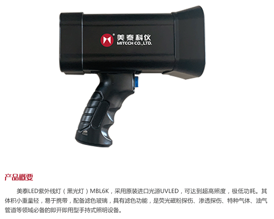 美泰LED紫外線燈(黑光燈)MBL6K,采用原裝進(jìn)口光源UVLED,可達(dá)到超高照度,極低功耗。其體積小重量輕,易于攜帶,配備濾色玻璃,具有濾色功能,是熒光磁粉探傷、滲透探傷、特種氣體、油氣管道等領(lǐng)域必備的即開即用型手持式照明設(shè)備。