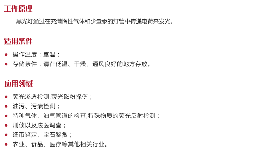 | 黑光波長(zhǎng) | 室溫25℃ UVA360nm±3nm |