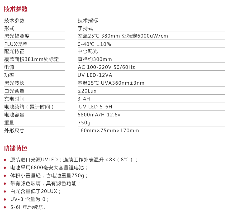 | 黑光幅照度 | 室溫25℃ 380mm 處標(biāo)定6000uW/cm2 |
