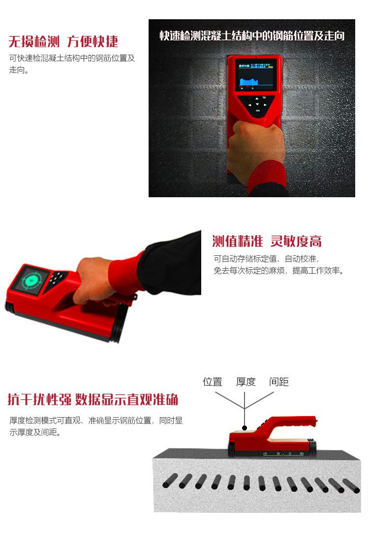 l 可檢測(cè)混凝土結(jié)構(gòu)中鋼筋的位置及走向,可自動(dòng)校準(zhǔn),以減小試值誤差;