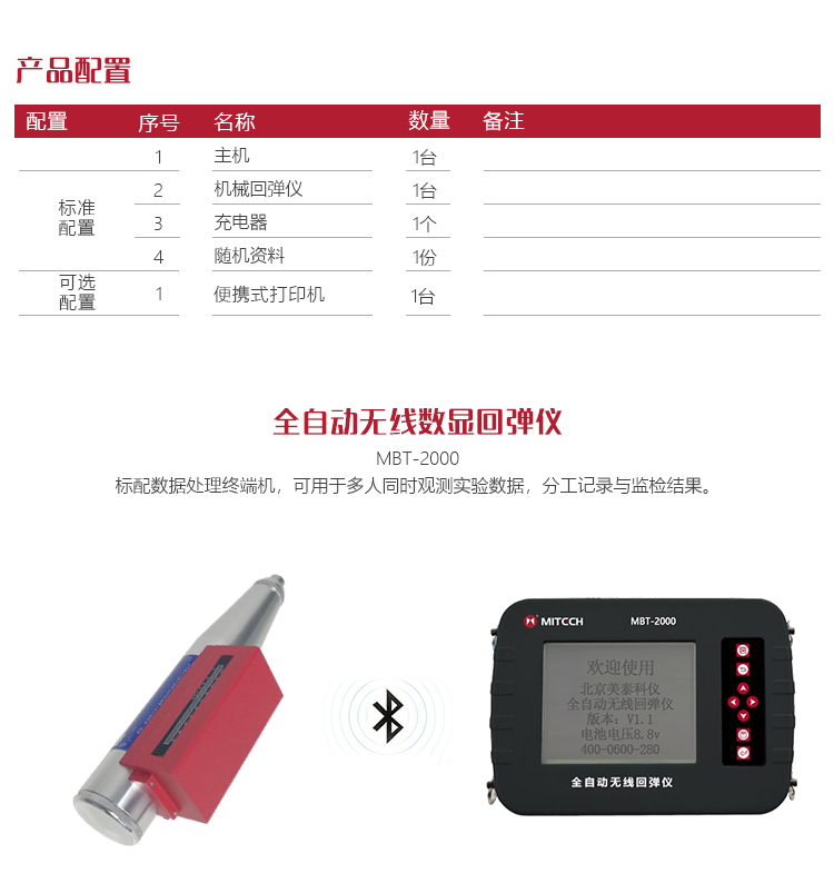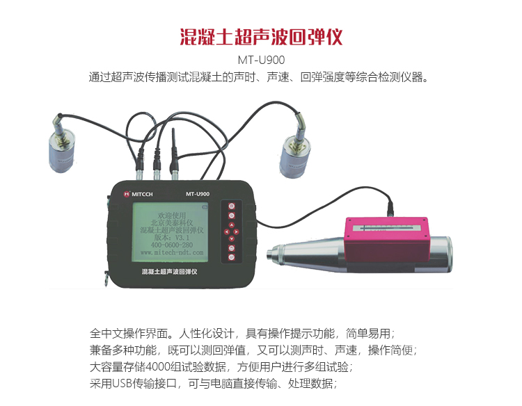 工作原理美泰MT-U900混凝土超聲波回彈儀,是一款功能強大的混凝土綜合檢測儀器。除具備普通回彈儀的強度測試功能外,可通過超聲波傳播測試混凝土的聲時、聲速等數(shù)值。其采用進口傳感器及先進的ARM處理器,測量快速準確,適用于各類建筑工程中普通混凝土抗壓強度的無損檢測,是保障工程質量、節(jié)約生產成本必備的精密檢測儀器。