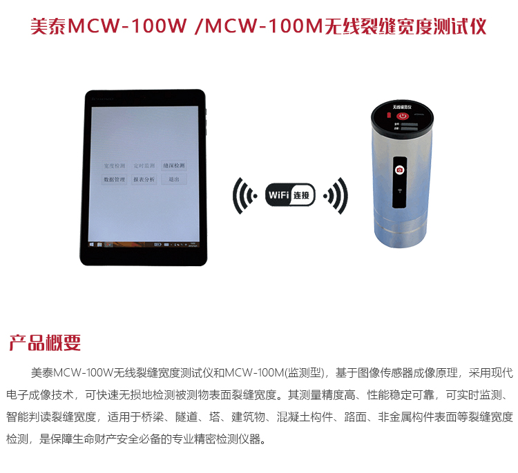 產(chǎn)品概述美泰MCW-100W無線裂縫寬度測(cè)試儀和MCW-100M(監(jiān)測(cè)型),基于圖像傳感器成像原理,采用現(xiàn)代電子成像技術(shù),可快速無損地檢測(cè)被測(cè)物表面裂縫寬度。其測(cè)量精度高、性能穩(wěn)定可靠,可實(shí)時(shí)監(jiān)測(cè)、智能判讀裂縫寬度,適用于橋梁、隧道、塔、建筑物、混凝土構(gòu)件、路面、非金屬構(gòu)件表面等裂縫寬度檢測(cè),是保障生命財(cái)產(chǎn)安全必備的專業(yè)精密檢測(cè)儀器。