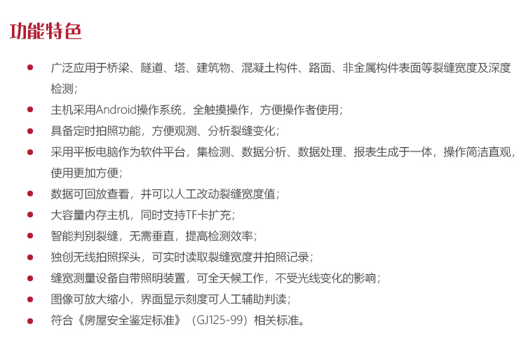 功能用途l 廣泛應(yīng)用于橋梁、隧道、塔、建筑物、混凝土構(gòu)件、路面、非金屬構(gòu)件表面等裂縫寬度及深度檢測(cè);