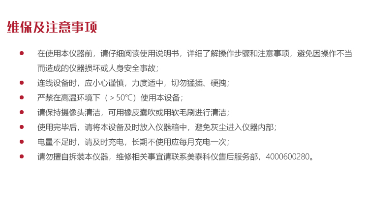 l 請勿擅自拆裝本儀器,維修相關(guān)事宜請聯(lián)系美泰科儀售后服務(wù)部,4000600280。